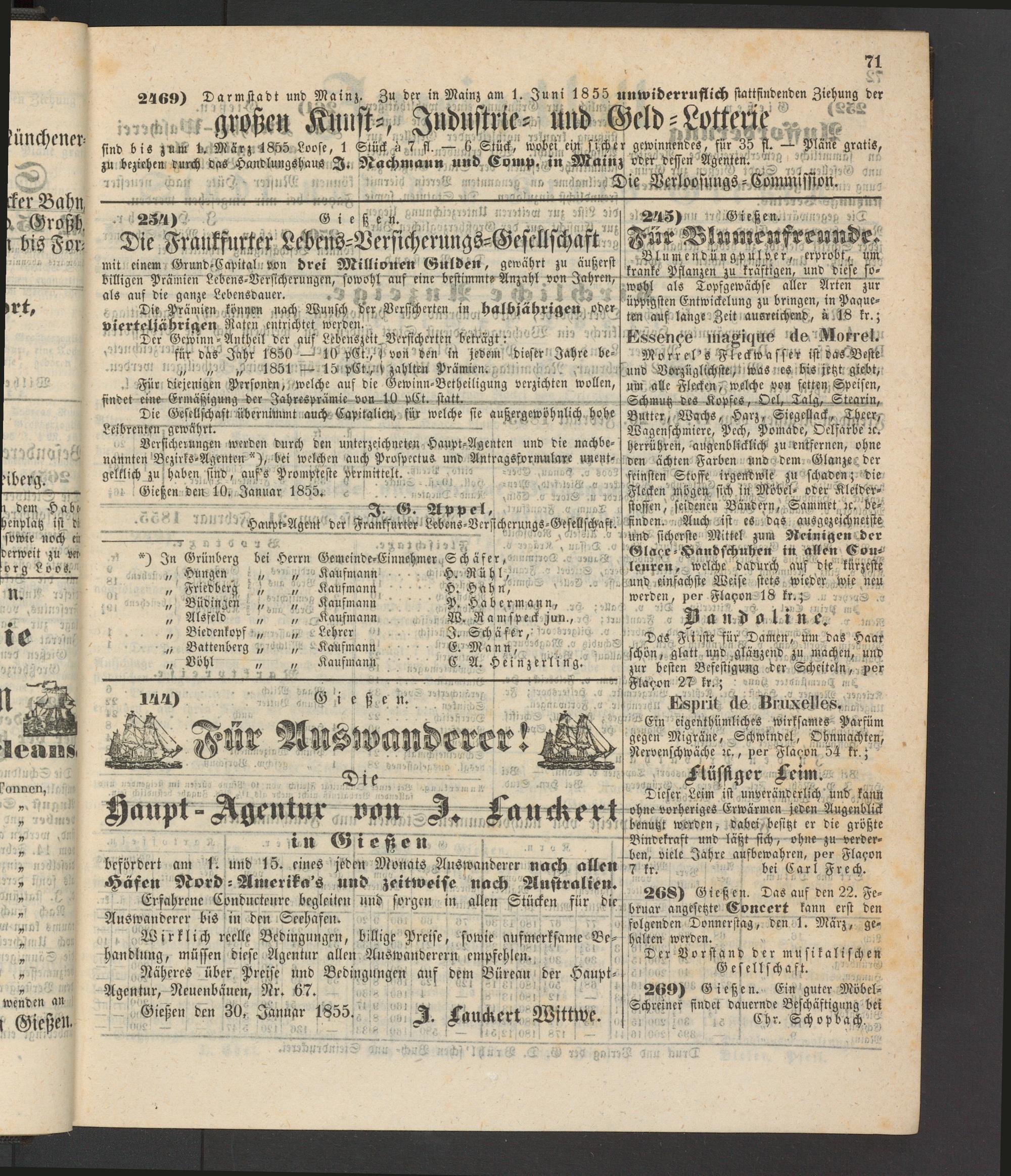 Gießen den 30, Januar 1855. I Lancktrt WlttWe.