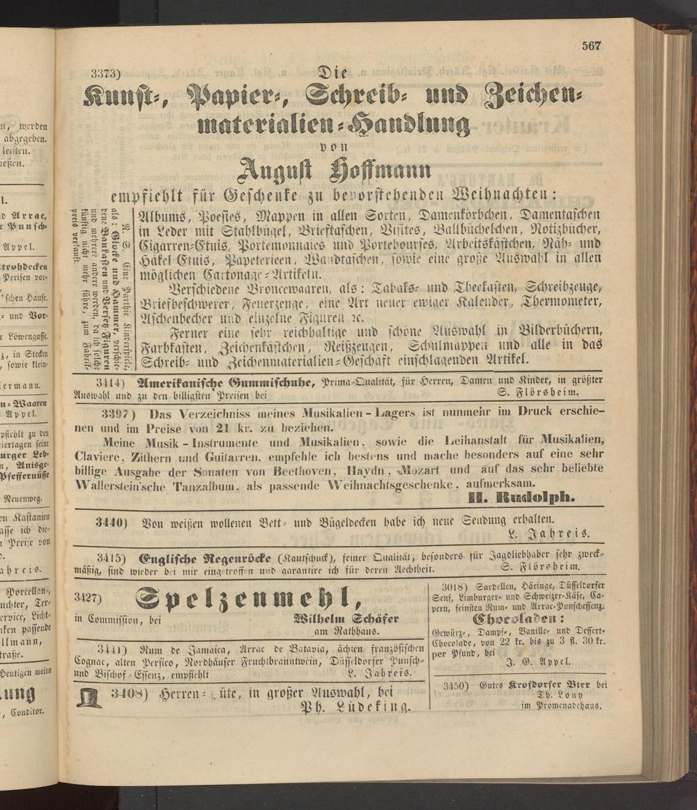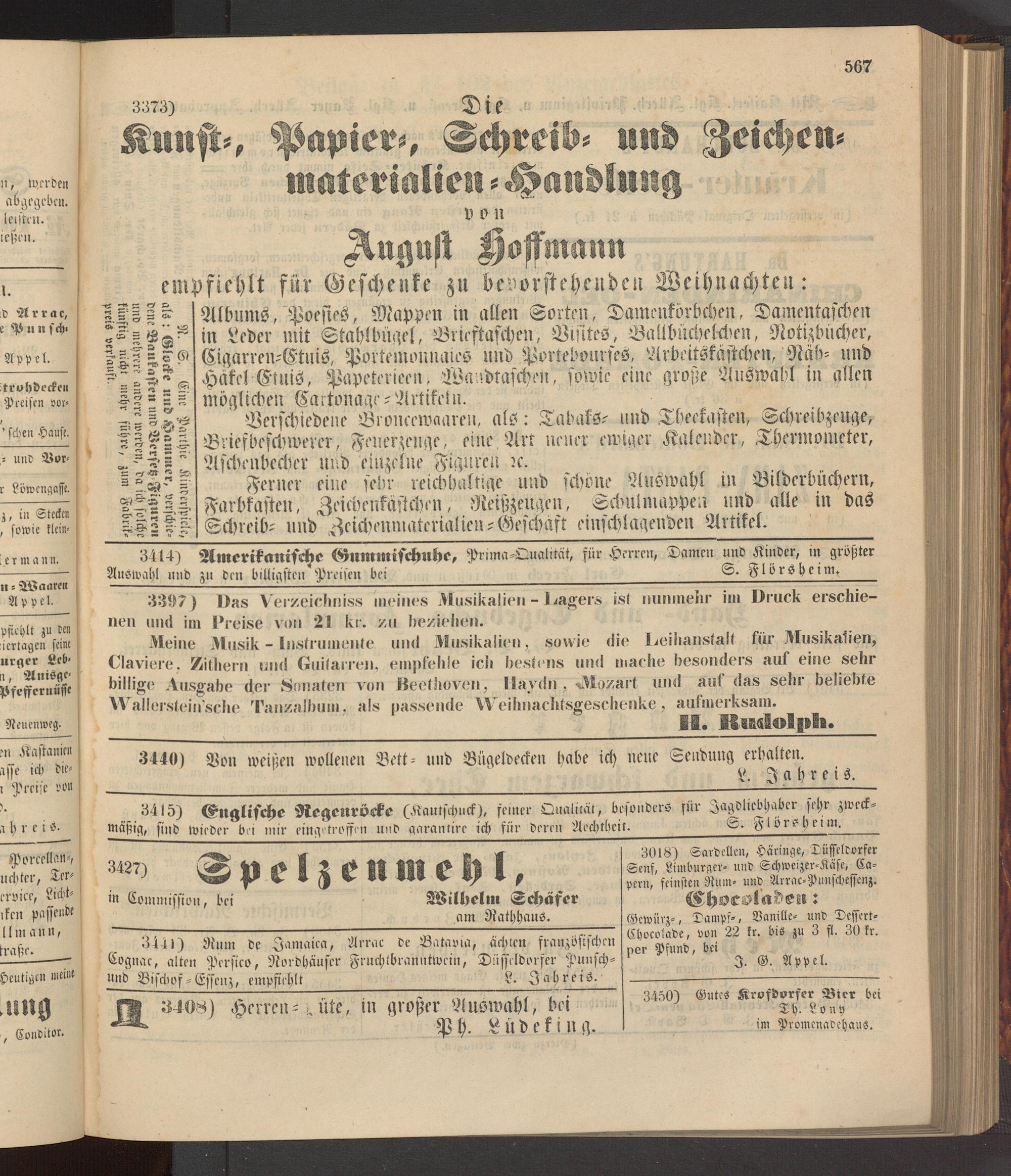 Meine Musik - Instrumente und Musikalien, sowie die Deihanstalt für .Musikalien, Claviere. Zithern und Guitarren, empfehle ich bestens und mache besonders auf eine sehr billige Ausgabe der Sonaten von Beethoven, Haydn , -Mozart und auf das sehr beliebte Wallerstein'sche Tanzalbum. als passende Weihnachtsgeschenke, aufmerksam.
