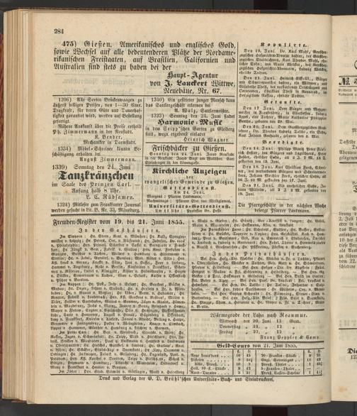 Bei Hrn. Hofg -Adv. Weicker : Hr. Welcker n. Fr. u. Tochter, Pfarrer v. Oberofleiden, Hr. Welcker n. Tochter, Geh. Rath u. Hr. Schmidtborn, Pfarrer v. Heidelberg. — Bei Hrn. Hofger - Dir. Dr. Klipstein : Fräul. Hergert v. Wallau u. Fcl. Schleuning v. Heidelberg. — Bei Hrn. Äg. Becker : 8 Frls. Hoffmann v. Grünberg — Bei Hrn. Busch im Garten l Frl. Beder v. Alzey — Bei Hrn. Prof. Dr. Leuckart : Frl. Leuckart v. Helmstedt. — Bei Hrn. Dr. Taschü : Hr Tas.hü, Jnspector v. Salzhausen. — Bei Hrn. Lehrer Curschmann : Hr. Wilhelm, Oec. v. Monsheim. — Bei Hrn. Cantor Schwabe : Hr. Flämming, Steuer - Einn. v. Battenberg. — Bei Hrn Hofg.-Adv. Stiel: 2 Frls. Stiel v. Darmstadt, Hr. Plagge, Chem. v. Havanna u. Hr. Meyer n. Fr. u. T.chter, Maler v. Berlin.