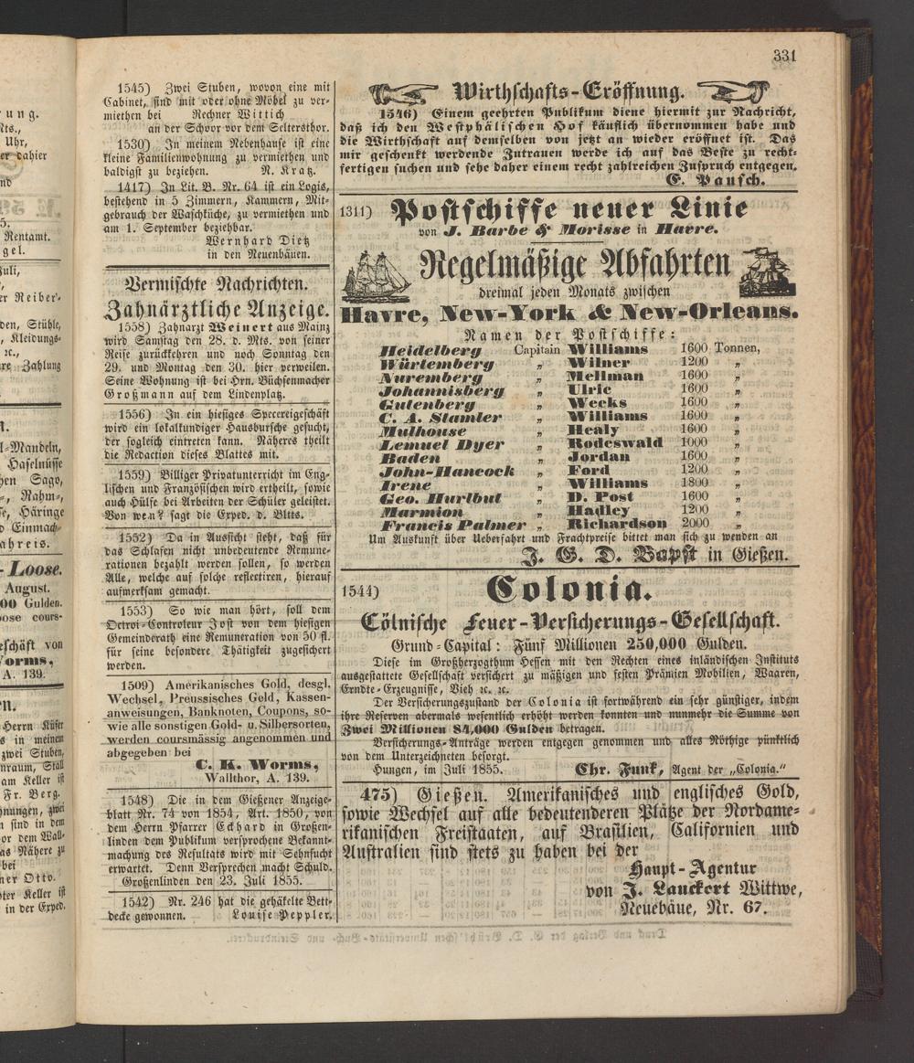 Hungen, im Juli 1855. Chr. Funk, Agent der „Colonia."