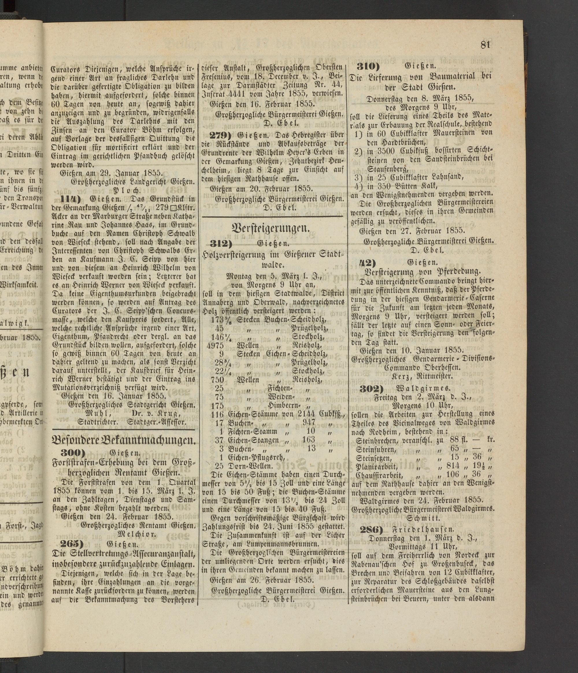 Gießen am 26. Februar 1855. Großherzogliche Bürgermeisterei Gießen.