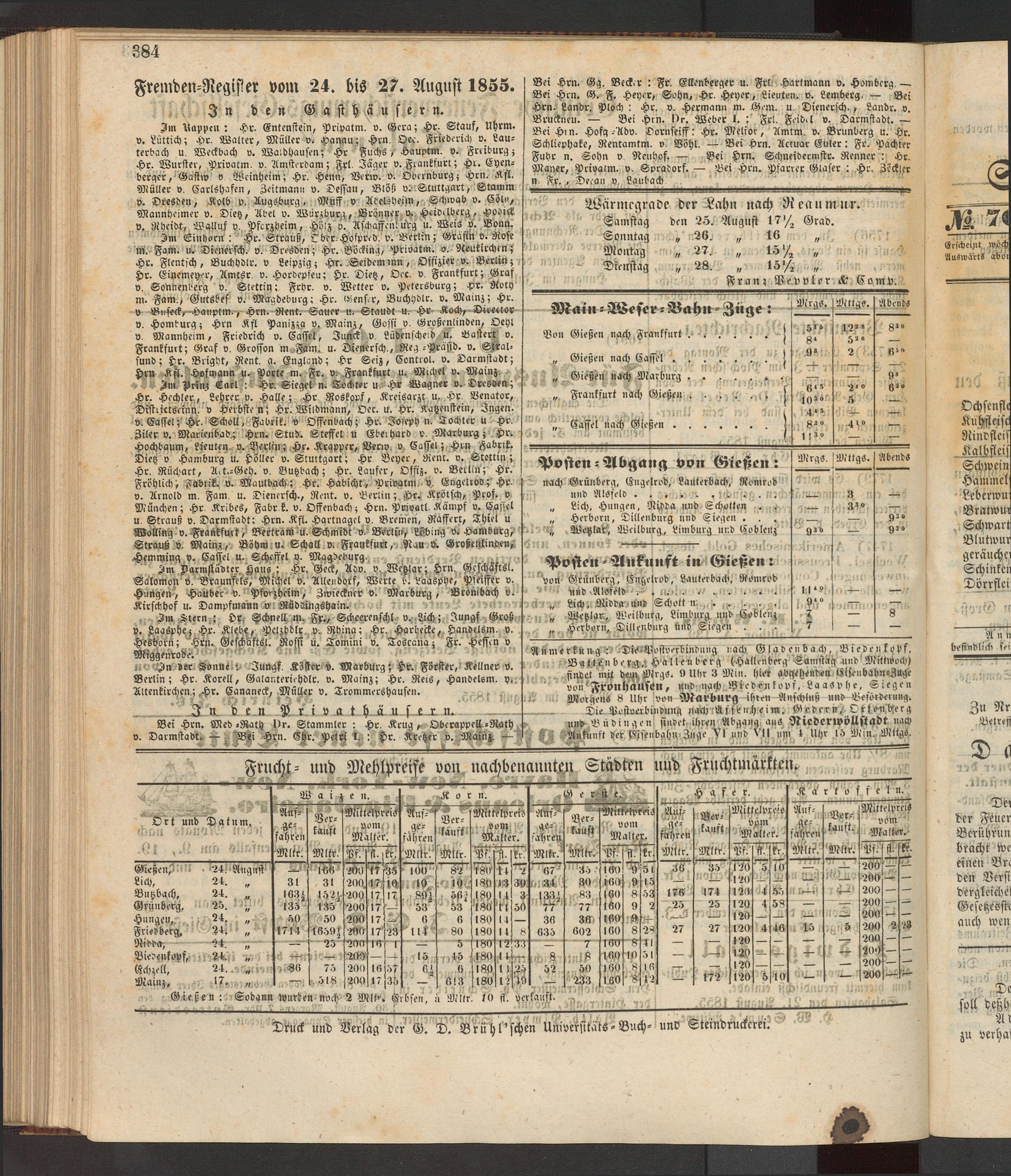 Bei Hrn. Gg. Becker : Fr. Ellenberger u. Frl. Hartmann v. Homberg. — Bei Hrn. G. F. Heyer, Sohn, Hr. Heyer, Lieuten. v. Lemberg. — Bei Hrn. Landr. Ploch : Hr. v. Hermann m. Gem. u. Dienersch., Landr. v. Bruckneu. — Bei Hrn. Dr. Weber I. : Frl. Feid.l v. Darmstadt. — Bei H,n. Hofq -Adv. Dornseiffl Hr. Meliot, Amtm. v. Brunberg u. Hr. Schliephake, Rentamtm. v. Böhl. — Bei Hrn. Acluar Euler: Fr. Pachter Fuhr n. Sohn v. Neuhof. — Bei Hrn. Schneidermstr. Renner : Hr. Mayer, Privatm. v. Spradorf. — Bei Hrn. Pfarrer Glaser : Hr. Zcckler n Fr. , Deean v. Laubach