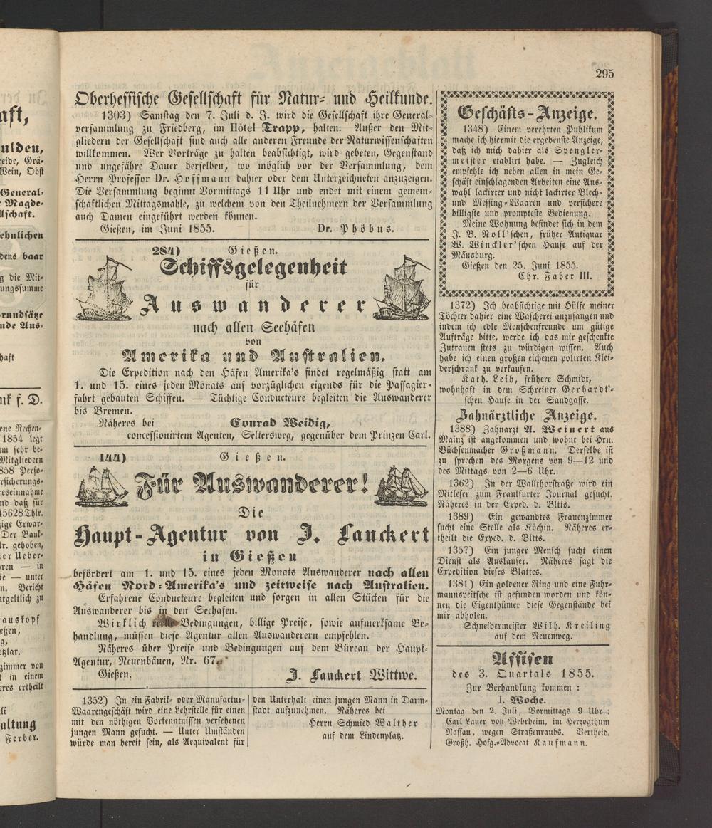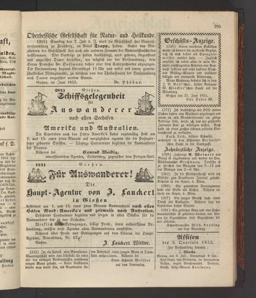 Die Erpedition nach den Häsen Amerika's findet regelmäßig statt am 1. und 15. eines jeden Monats anf vorzüglichen eigends für die Passagier- fahrt gebauten Schiffen. — Tüchtige Convucteure begleiten die Auswanderer bis Bremen.