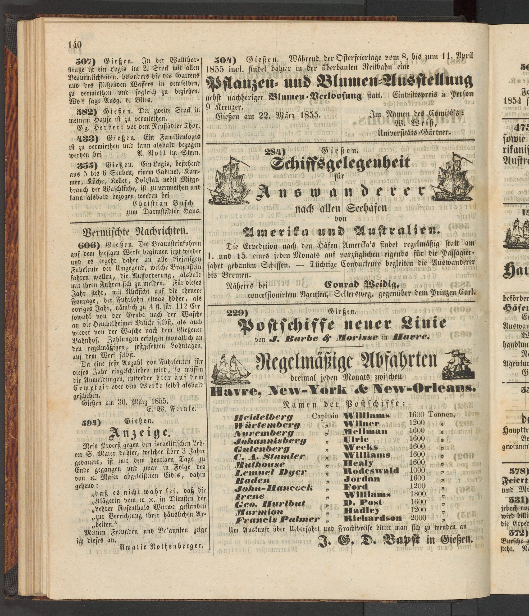 304) Gießen. Während der Osterfeiertage vom bis zum 11. April 1855 incl. findet dahier in der überbauten Reitbahn eine «Pflanzen- und Blumen Ausstellung nebst nachheriger Blumen Berloosung statt. Eintrittspreis a Person 9 Kreuzer. „
