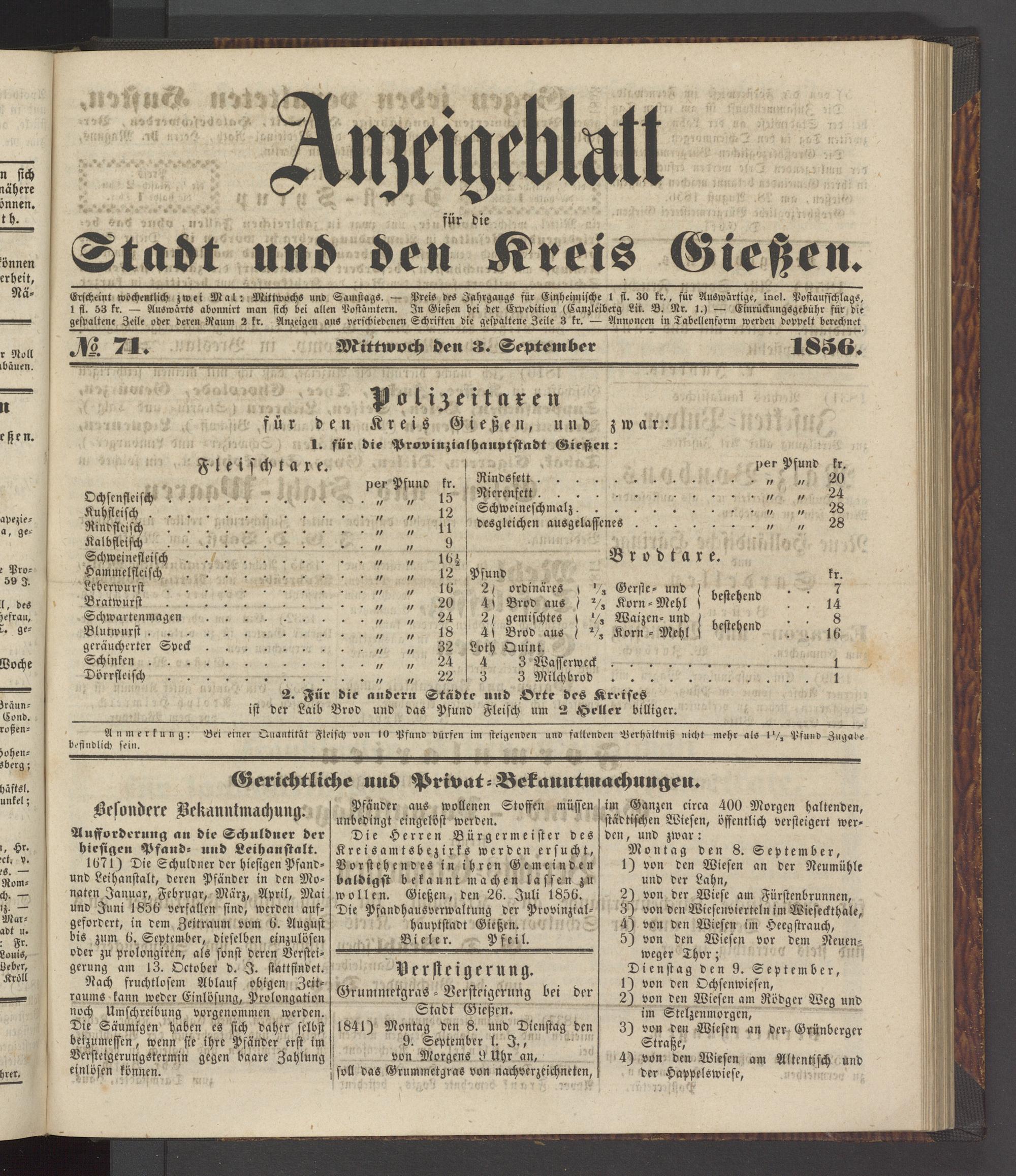 Die Herren Bürgermeister des Kreisamtsbezirks werden ersucht, Vorstehendes in ihren Gemeinden baldigst bekannt machen lassen zu wollen. Gießen, den 26. Juli 1856. Die Pfandhausverwaltung der Provinzialhauptstadt Gießen.