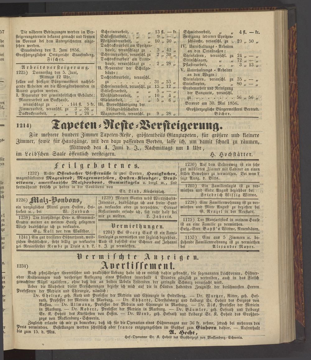 Zugleich erlaube ich mir zu bemerken, daß ich für die Operation eines Hühnerauges nur 36 kr. nehme, jedoch bei mehreren den Preis vermindere. Bestellungen werden schriftlich aber franco entgegengesehen int Gasthof zum Einhorn dahier. — Aufenthalt b-s zum 15. d. Mts. A. Hecht,