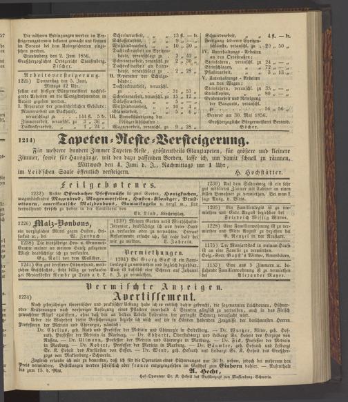 Für mehrere hundert Zimmer Tapeten-Reste, größtentheils Glanztapeten, für größere und kleinere Zimmer, sowie für Hausgänge, mit den dazu passenden Borden, lasse ich, um damit schnell zu räumen, Mittwoch den 4. Juni d. I., Nachmittags um 1 Uhr, im Le ib'schen Saale öffentlich versteigern. H. Hochstätt er.