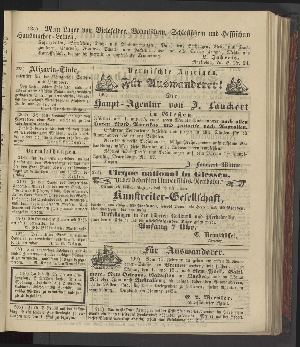 199) Vom 15. Februar an gehen die ersten Auswanderer-Schisse von Bremen wieder, wie früher, jeden Monat, den 1. und 15., nach New Rork. Balri more, .tew vrleans, Galveston und LSuebec? und im Monat Australien; ich bringe daher den Auswanderern, welche ^Willens stnd, sich dieser Gelegenheit zu bedienen, meine Agentur in