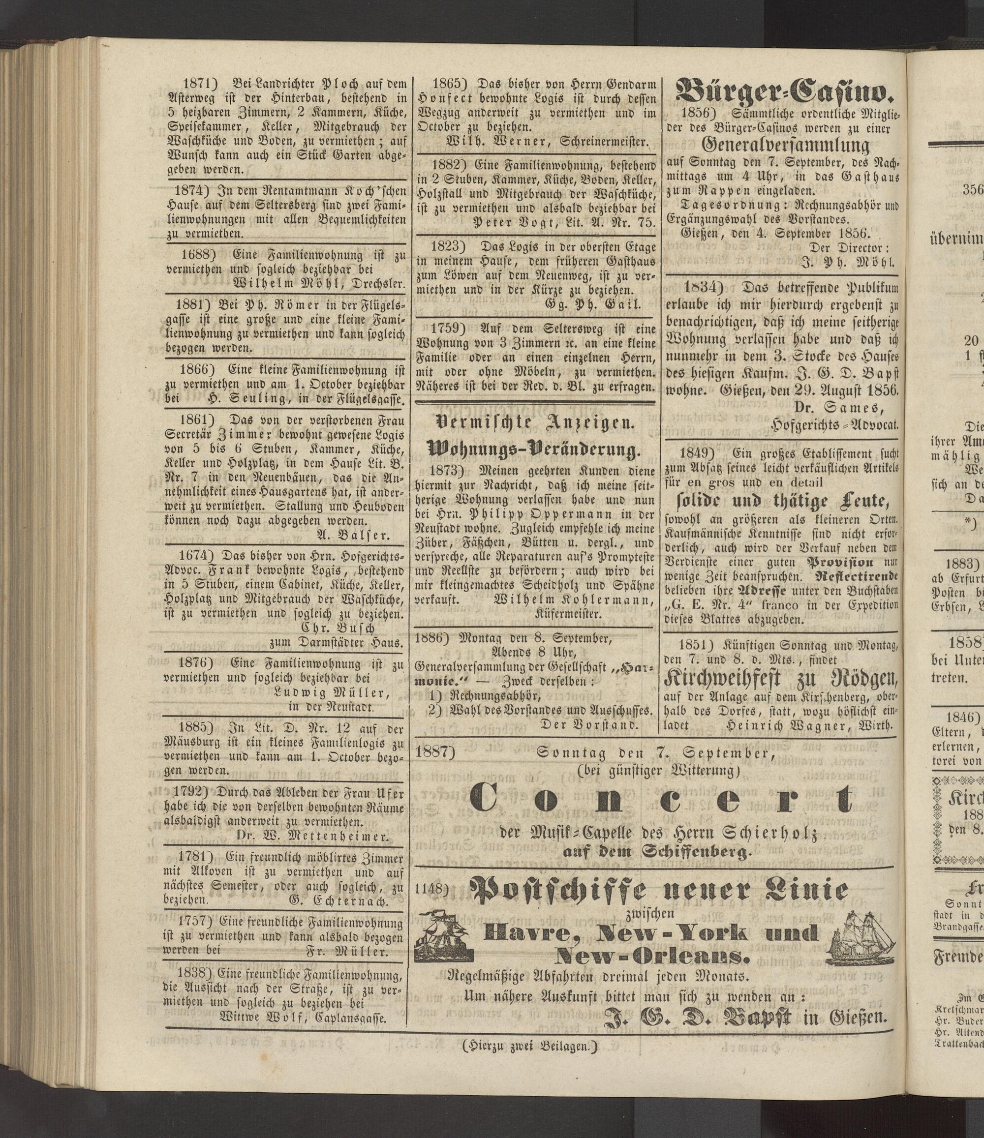 18>34) Das betreffende Publikum erlaube ich mir hierdurch ergebenst zu benachrichtigen, daß ich meine seitherige Wohnung verlassen habe und daß ich nunmehr in dem 3. Stocke des Hauses des hiesigen Kaufm. Z. G. D. La pst wohne. Gießen, den 29. August 1856.