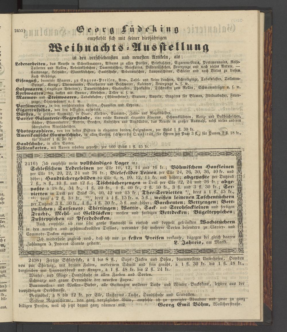 Lederarbeiten, das Neueste in Schreibmappen, Albums zu allen Preisen, Brieftaschen, Cigarren-EtuiS, Portemonnaies, Reise- Toileiten und Nollen, Arbeitskörbchen, Damentaschen, Necessaires, Bisttentäschchen, Feuerzeuge und noch vieles Andere.— Cartonage, Lesepulte, Wanvkörbchen, Handschuhe, Arbeitstaschen, Lampenschirme, Schleier und noch Vieles zu diesem