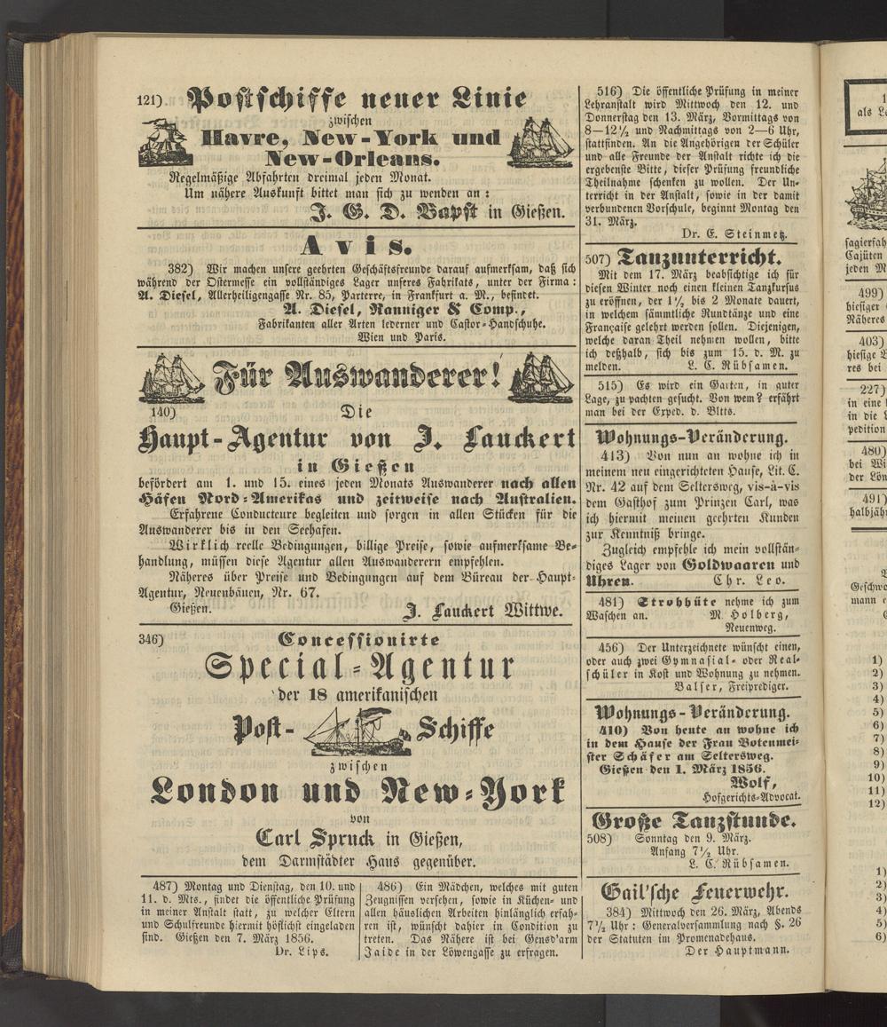 487) Montag und Dienstag, den 10. und 11. d. Mts., findet die öffentliche Prüfung in meiner Anstalt statt, zu welcher Eltern und Schulfreunde hiermit höflichst eingeladen sind. Gießen den 7. März 1856.