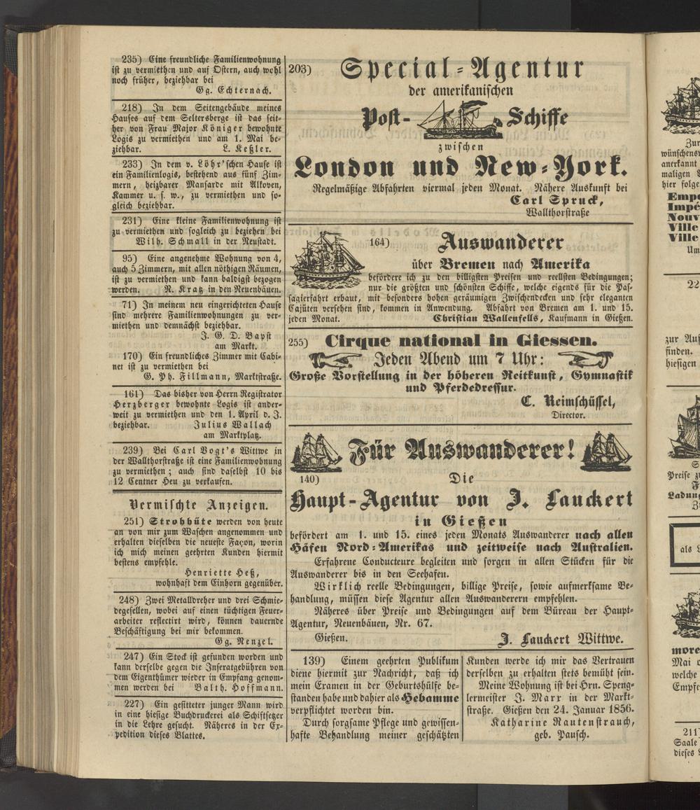 Cajüten versehen sinv, kommen in Anwendung. Abfahrt von Bremen am 1. und 15. jeden Monat. Christian Wallensells, Kaufmann in Gießen.