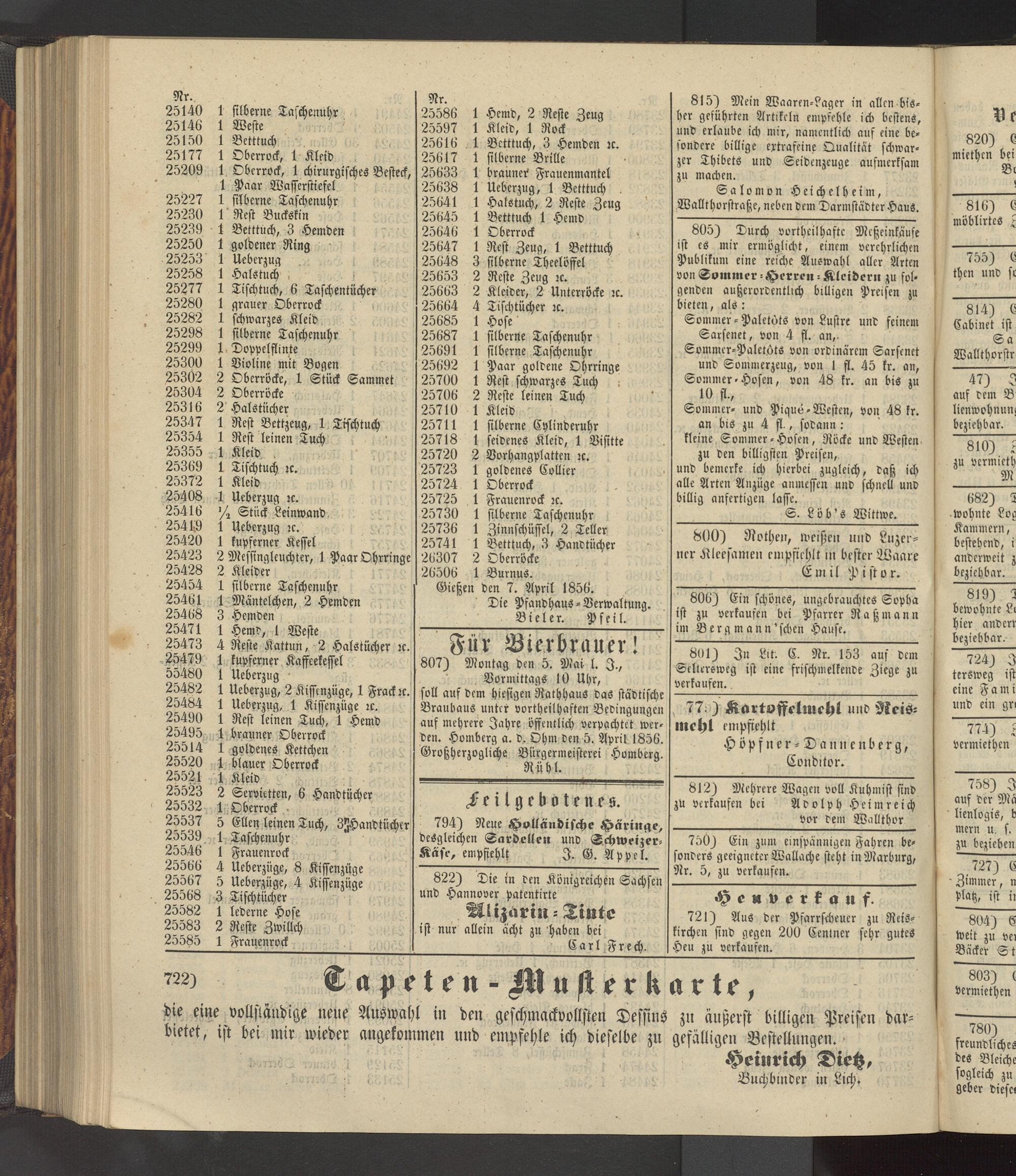 815) Mein Waaren-Lager in allen bisher geführten Artckeln empfehle ich bestens, und erlaube ich mir, namentlich auf eine besondere billige extrafeine Qualität schwarzer Thibets und Seidenzeuge aufmerksam zu macken.