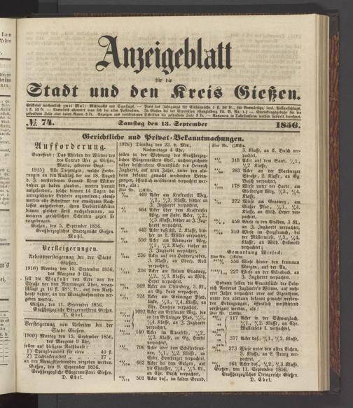 Gießen, den 9. September 1856. Großherzogliche Bürgermeisterei Gießen.