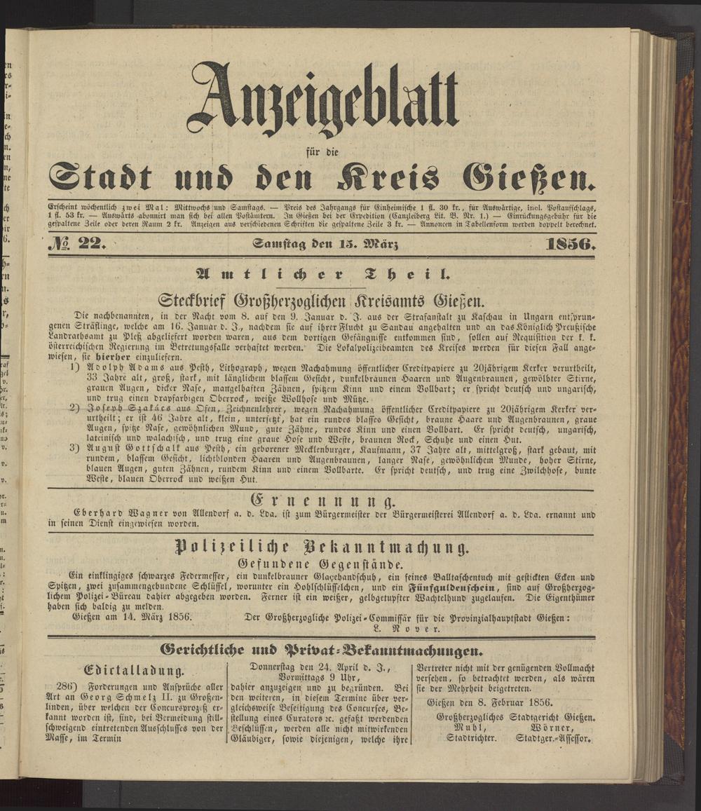 Gießen am 14. März 1856. Der Großherzogliche Polizei-Commissär für die Provinzialhauptstadt Gießen: