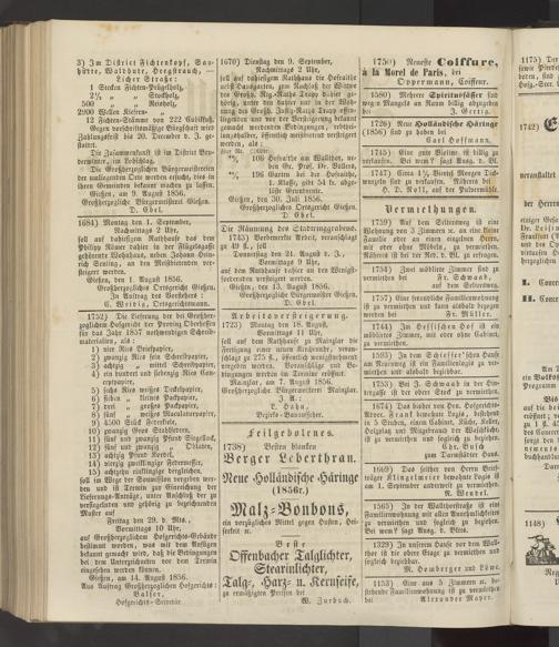 Gießen, am 9. August 1856. Großhcrzogiiche Bürgermeisterei Gießen. _____________D. Ebel._____________ 1684) Montag den 1. September, Nachmittags 2 Uhr,