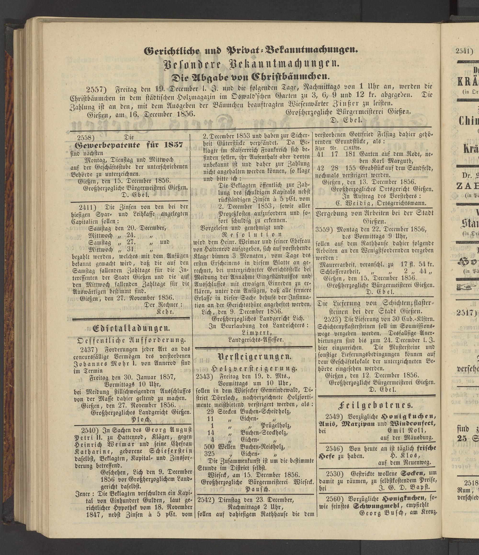 Gießen, am 16. Deccmber 1856. Großhcrzogliche Bürgerme.sterel Gießen.