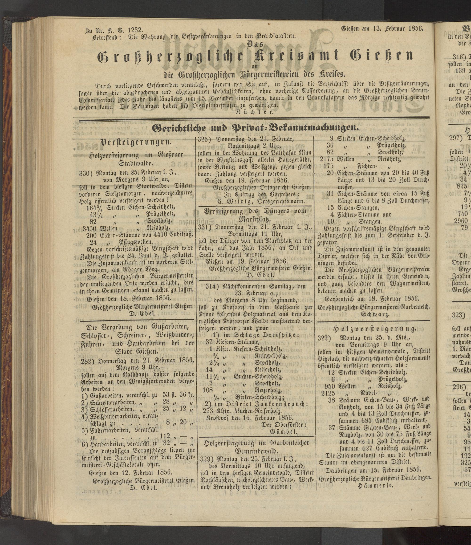 Gießen am 19. Februar 1856. Großherzogliche Bürgermeisterei Gießen. ______________D. Ebel.___________