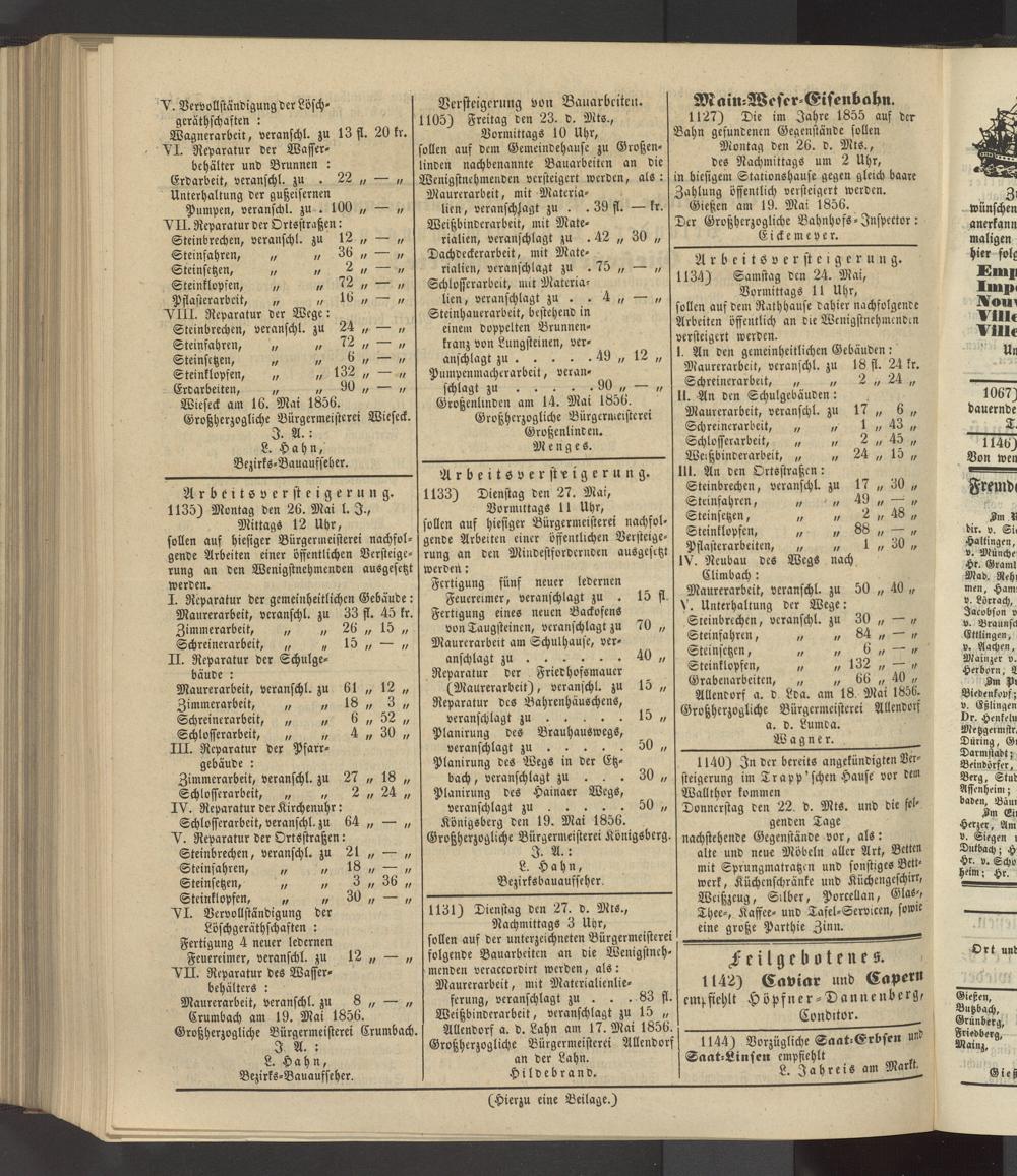 A r b e i t s v e r st e i g e r u n g. 1134) Samstag Den 24. Mai, Vormittags 11 Uhr, ollen auf Dem Rathhause dahier nachfolgende Arbeiten öffentlich an die Wenigstnehmendcn