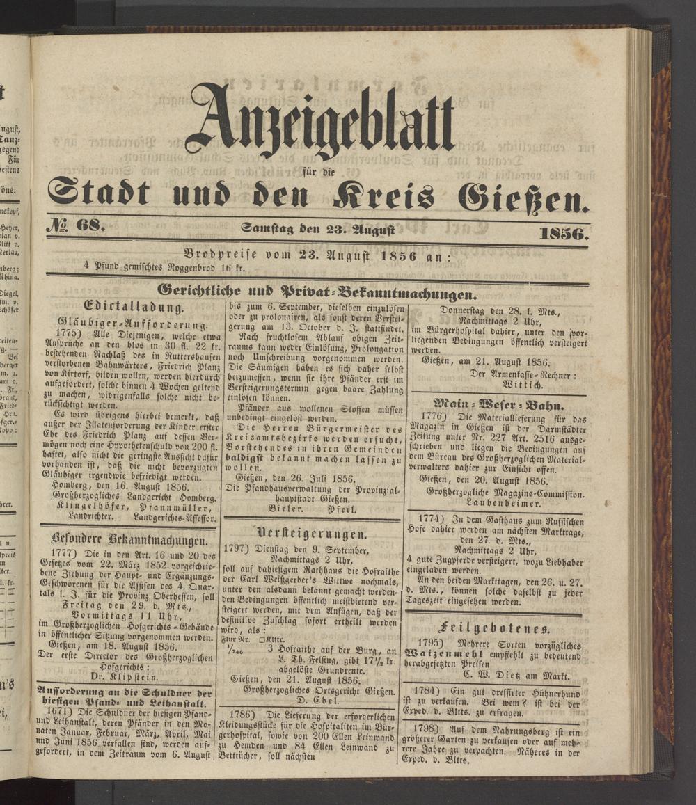 Gießen, den 21. August 1856. Großherzogliches Ortsgericht Gießen. D. Ebel.