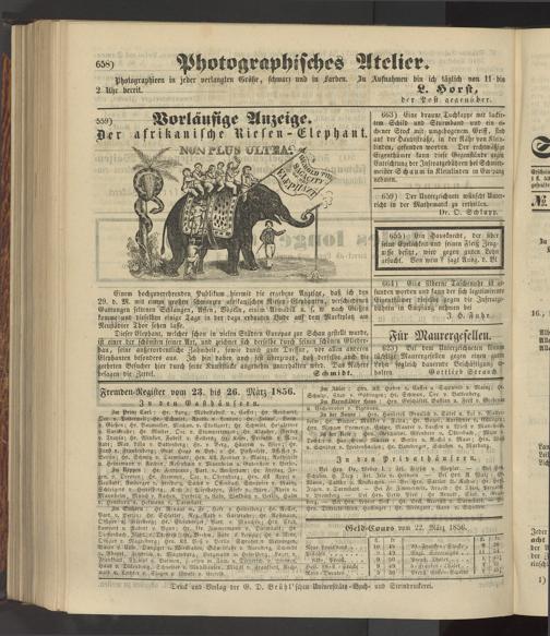 Dieser Elephant, welcher schon in vielen Städten Europas zur Schau gestellt wurde, ist einer ter schönsten seiner Art, und zeichnet sich derselbe durch seinen schönen Glicder- bau, seine außerordentliche Zahmheit, sowie durch gute Dressur, vor allen anderen Elcphanten besonders aus. Ich bin daber auch fest überzeugt, daß derselbe auch die geehrten Besucher hier durch seine Kunststücke angenehm unterhalten wird. Das Nähere besagen die Zettel. Schmidt.