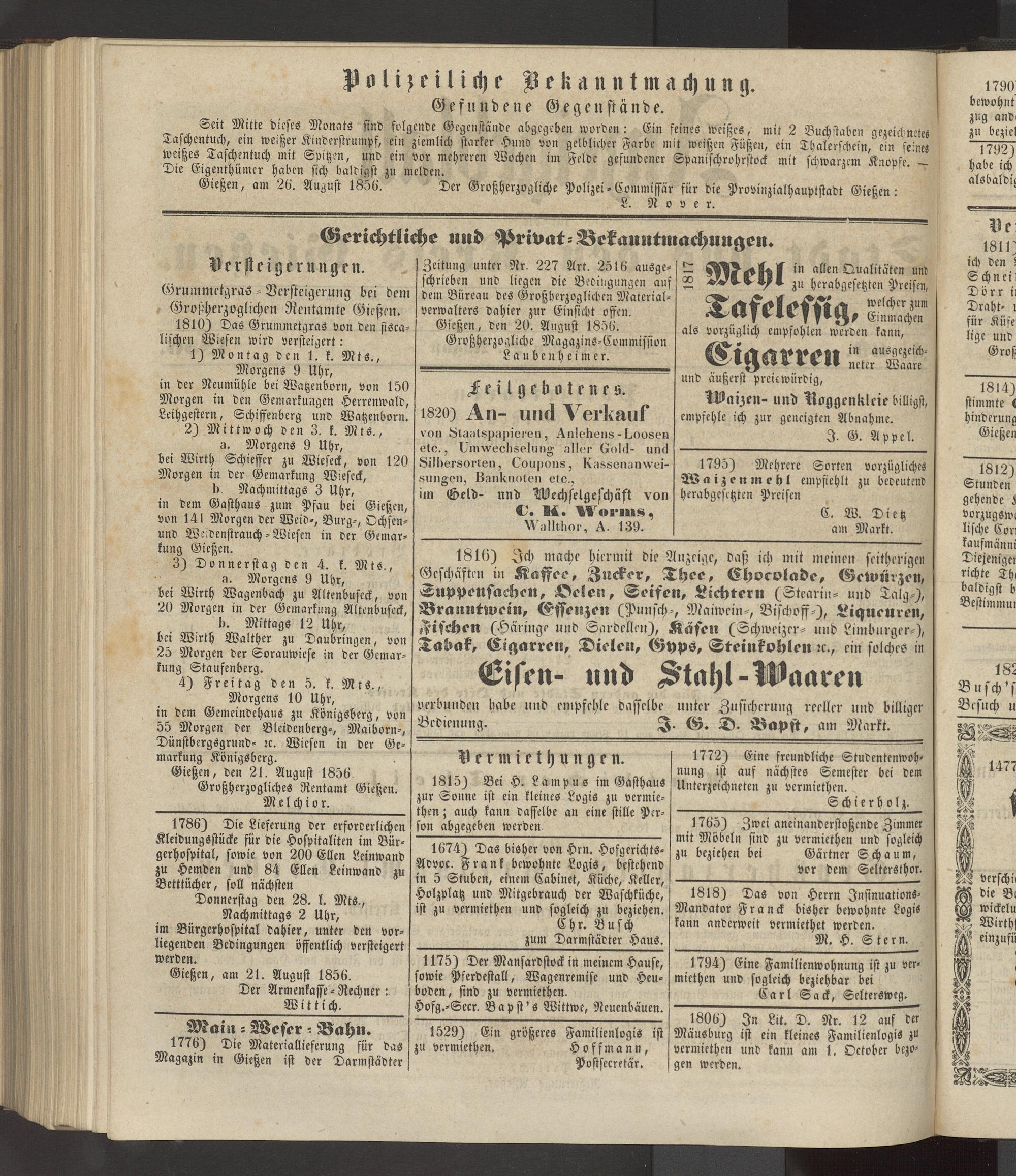 Gießen, am 26. August 1856. Der Großherzogliche Polizei -Eommissär für die Provinzialhauptstadt Gießen: