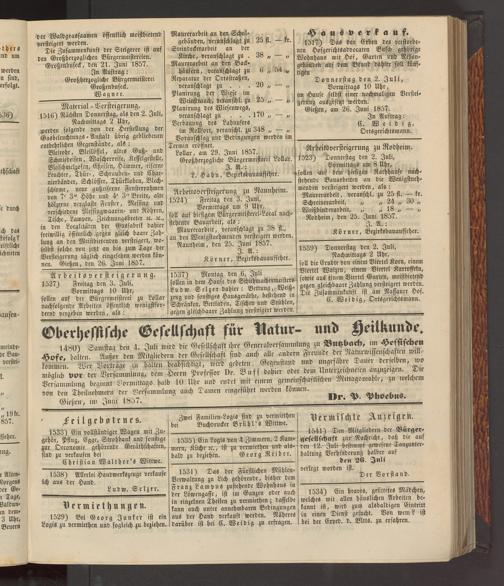 1480) Samstag den 4. Juli wird die Gesellschaft ihre Generalversammlung zu Butzbach, un Heimchen Hofe, balten. Außer den Mitgliedern der Gesellschaft sind auch alle andern Freunde der Naturwlssenschaf ey kkmmm. Wer VoRräge zu halten beabsichtigt, wird gebeten, Gegenstand und unwahre Dauer derselben, wo möalich vor der Versammlung, dem Herrn Professor Dr. Buff dahier oder dem Unterzelchlteten anzuzeigen. De Versammlung beginnt Vormittags halb 10 Uhr und endet mit einem gemeinschaftlrchcn Mittagsmahl?, zu welchem von den Theilnehmern der Versammlung auch Damen eingeführt werden können. Dboebus.