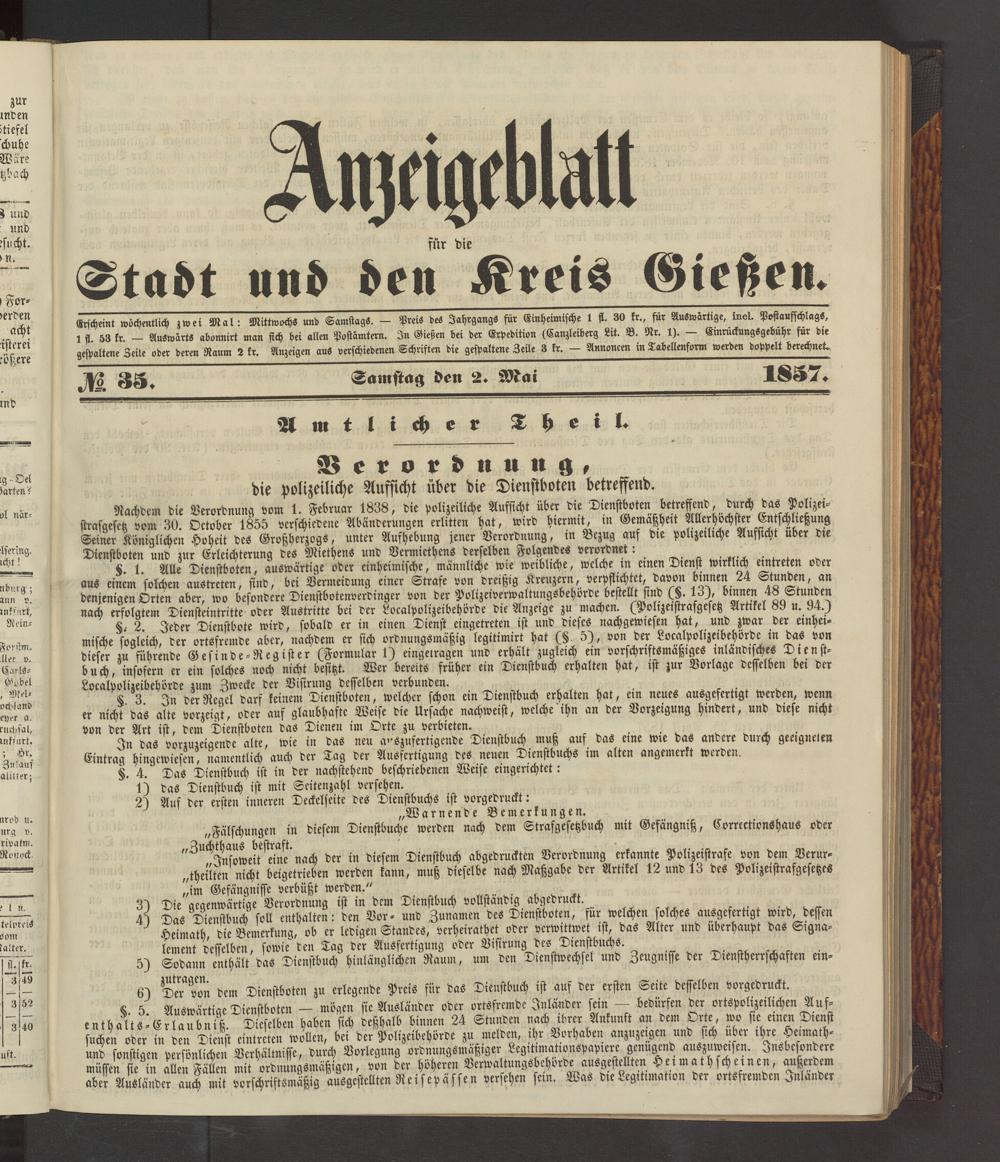 Erscheint wöchentlich zwei Mal: Mittwoch« und Samstag«. - Preis de« Jahrgang« für Einheimische 1 ff. 30 kr., für Auswärtige, inol. Postauffchlag«, 1 st 53 kr. — Auswärts abonnirt man sich bei allen Postämtern. In Gießen bei der Erpedition (Canzleiberg Lit. B. Nr. 1). — EmruckungSgebuhr für die gespaltene Zeile oder deren Raum 2 kr. Anzeigen aus verschiedenen Schriften die gespaltene Zeile 3 kr. - Annoncen in Tabellenform werden doppelt berechnet.