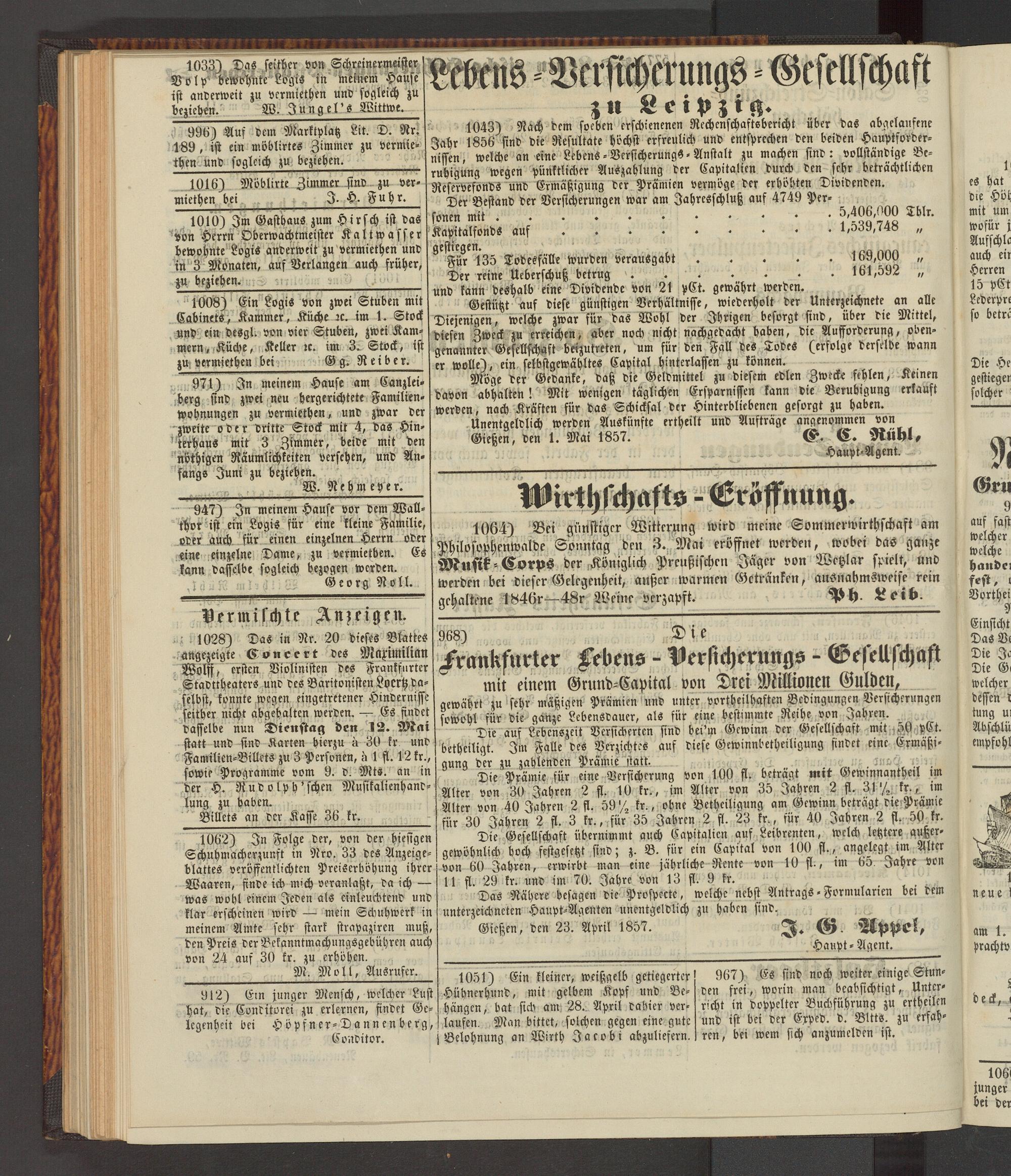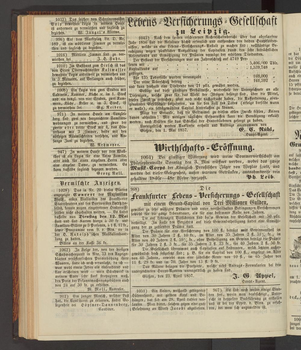 Unentgeldlich werden Auskünfte ertheilt und Aufträge angenommen von Gießen, den 1. Mai 1857. C-