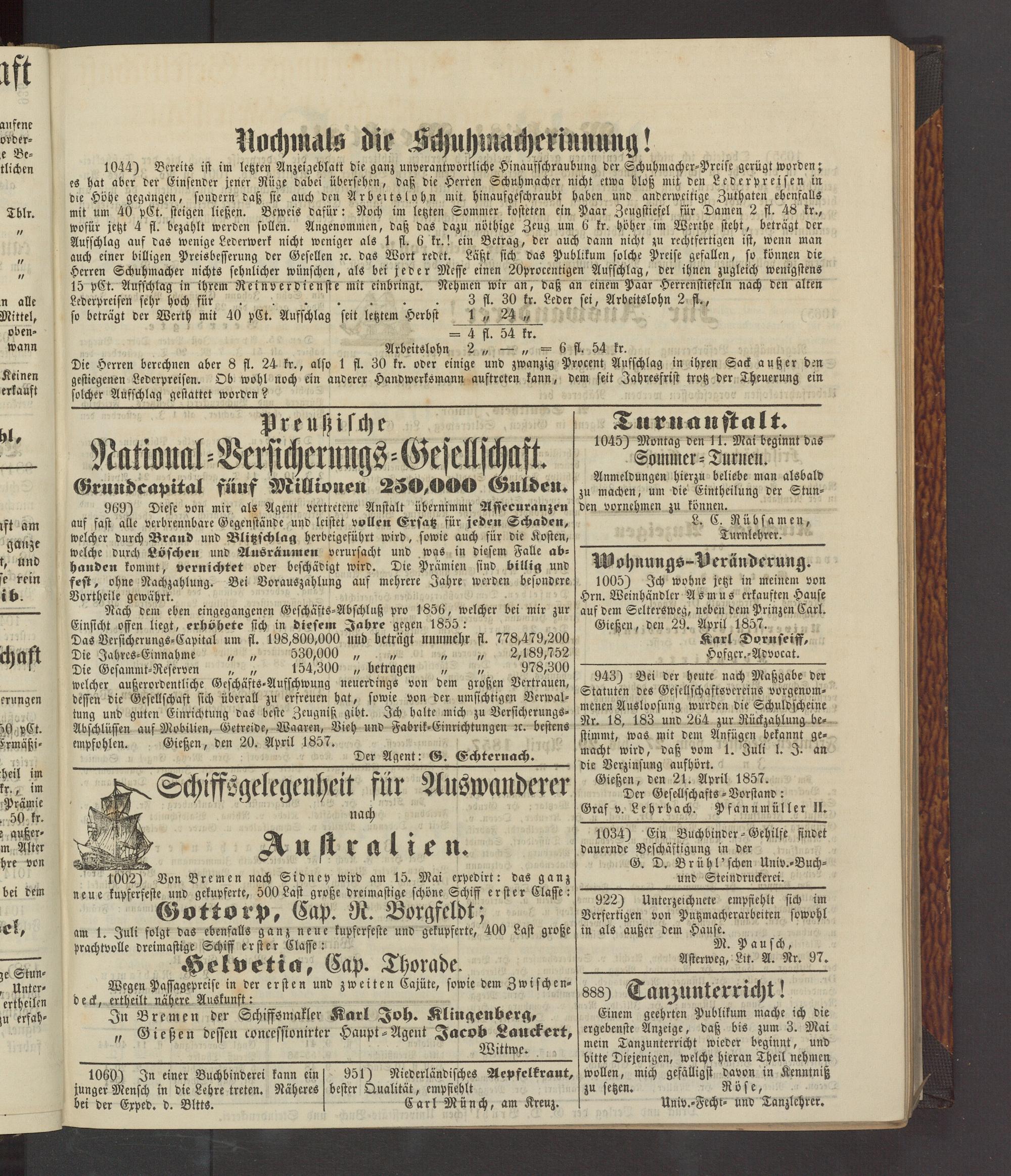 welcher außerorDentliche Geschäfts-Aufschwung neuerdings von dem großen Vertrauen, dessen Die Gesellschaft sich überall zu erfreuen hat, sowie von der umsichtigen Verwaltung und guten Einrichtung das beste Zeugniß gibt. Ich halte mich zu Versicherungs- Abschlüssen auf Mobilien, Getreide, Maaren, Vieh und Fabrik-Einrichtungen re. bestens empfohlen. Gießen, den 20. April 1857.
