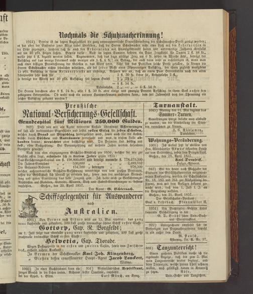 1002) Von Bremen nach Sidney wird am 15. Mai expedirt: das ganz neue kupferfeste und gekupferte, 500Last große dreimastige schöne Schiff erster Claffe: