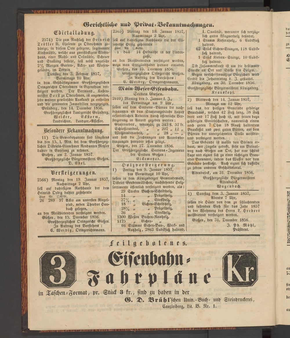 an den Meistbietenden versteigert werden, wozu man Steigllebhaber hiermit einiadet. Gießen, den 15. December 1856.