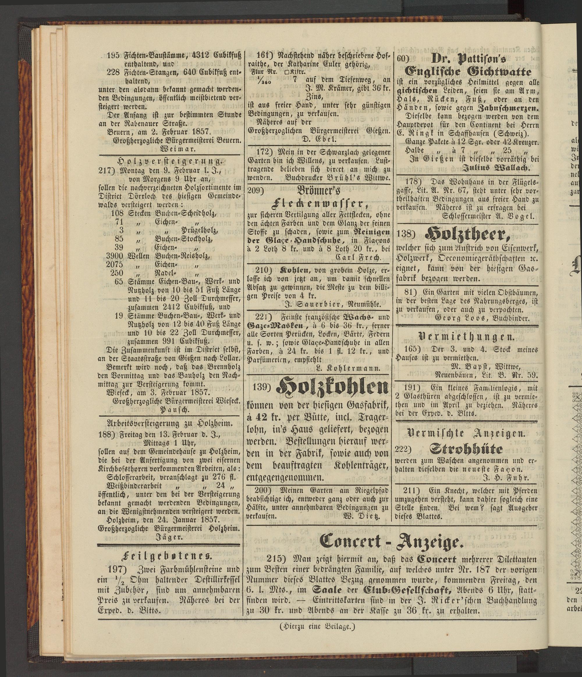 215) Man zeigt hiermit an, daß das Concert mehrerer Dilettanten zum Besten einer bedrängten Familie, auf welches unter Nr. 187 der vorigen Nummer dieses Blattes Bezug genommen wurde, kommenden Freitag, den 6. l. Mts., im Saale der Club-Gesellschaft, Abends 6 Uhr, statt- ß'nden wird. — Eintrittskarten sind in der I. Ricker'schon Buchhandlung zu 30 fr. und Abends an der Kasse zu 36 fr. zu erhalten.