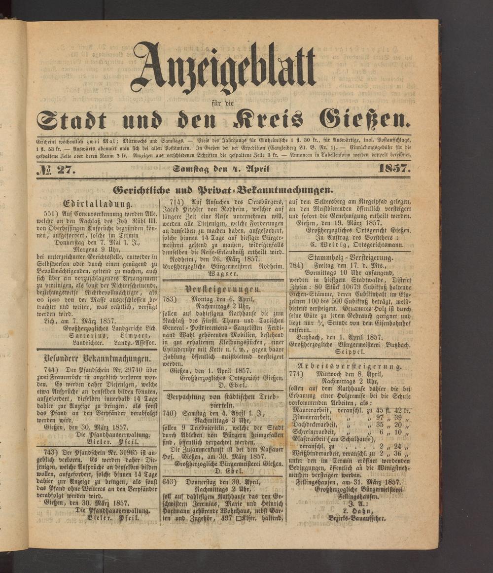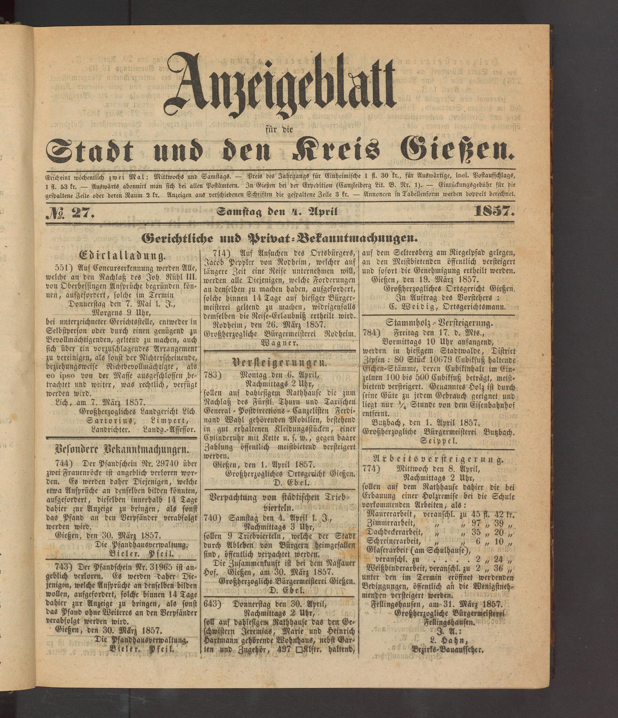 Erscheint wöchentlich zwei Mal: Mittwochs und Samstags. — Preis des Jahrgangs für Einheimische 1 fl. 30 kr., für Auswärtige, incl. Postaufschlags, 1 fl. 53 kr. — Auswärts abvnnirt man sich bei allen Postänitern. In Gießen bei der Erpeditivn (Canzleiberg Lit. B. Nr. 1). — Einrückungsgebühr für die gespaltene Zeile oder deren Raum 2 kr. Anzeigen ans verschiedenen Schriften die gespaltene Zeile 3 kr. — Annoncen in Tabellenform werden doppelt berechnet.