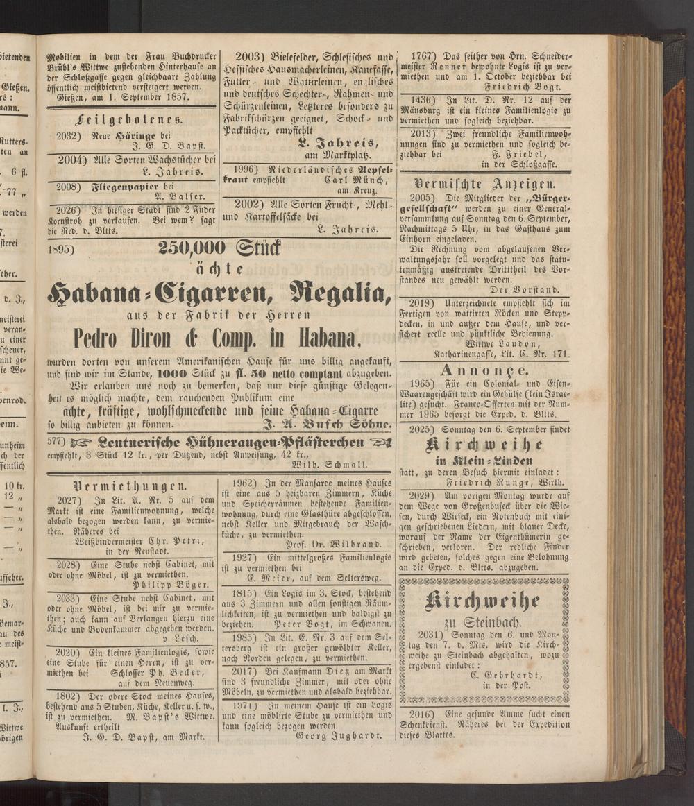 2029) Am vorigen Montag wurde auf dem Wege von Großenbuseck über die Wiesen, durch Wieseck, ein Notenbuch mit einigen geschriebenen Liedern, mit blauer Decke, worauf der Name der Eigenthümerin geschrieben, verloren. Der redliche Finder wird gebeten, solches gegen eine Belohnung an die Exped. d. Bltts. abzugeben.