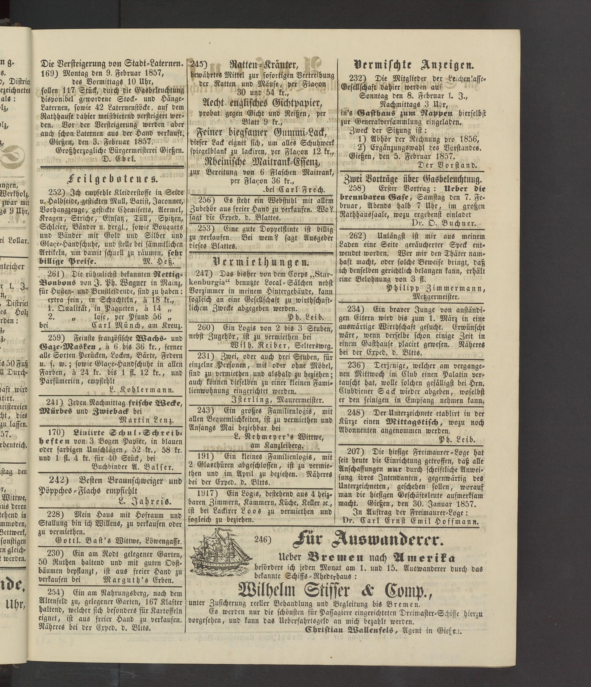 Gießen, den 3. Februar 1857. Großhrrzogliche Bürgermeisterei Gießen. D. Ebel.