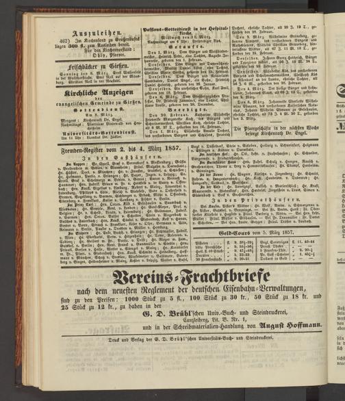 Im Darmstädter Hau» : Hrn. Fuhr!. Schulz v. Hungen, Rausch v. Großeneichen, Thome u. Lenz v. Hommertshausen; Hr. Stumpf, HandelSm. v. Gönningen.