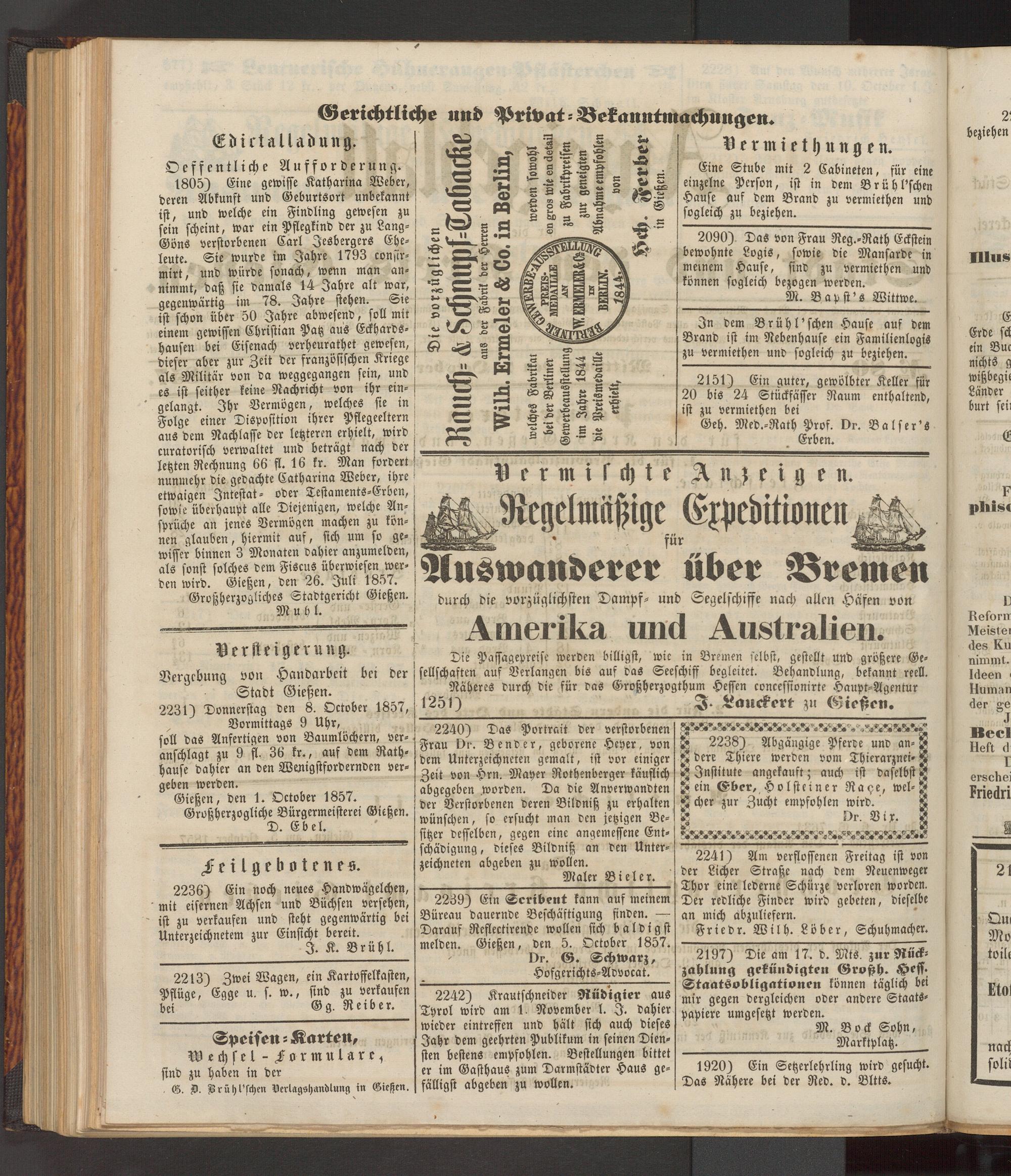 2239) Ein Scribent kann auf meinem Büreau dauernde Beschäftigung finden. — Darauf Reflectirende wollen sich baldigst melden. Gießen, den 5. October 1857.