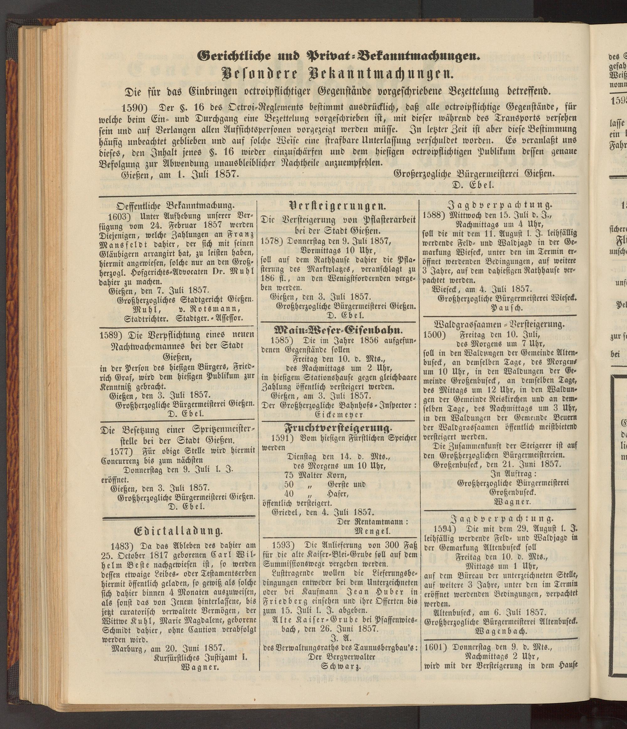 Gießen, am 1. Juli 1857. Großerzogliche Bürgermeisterei Gießen.