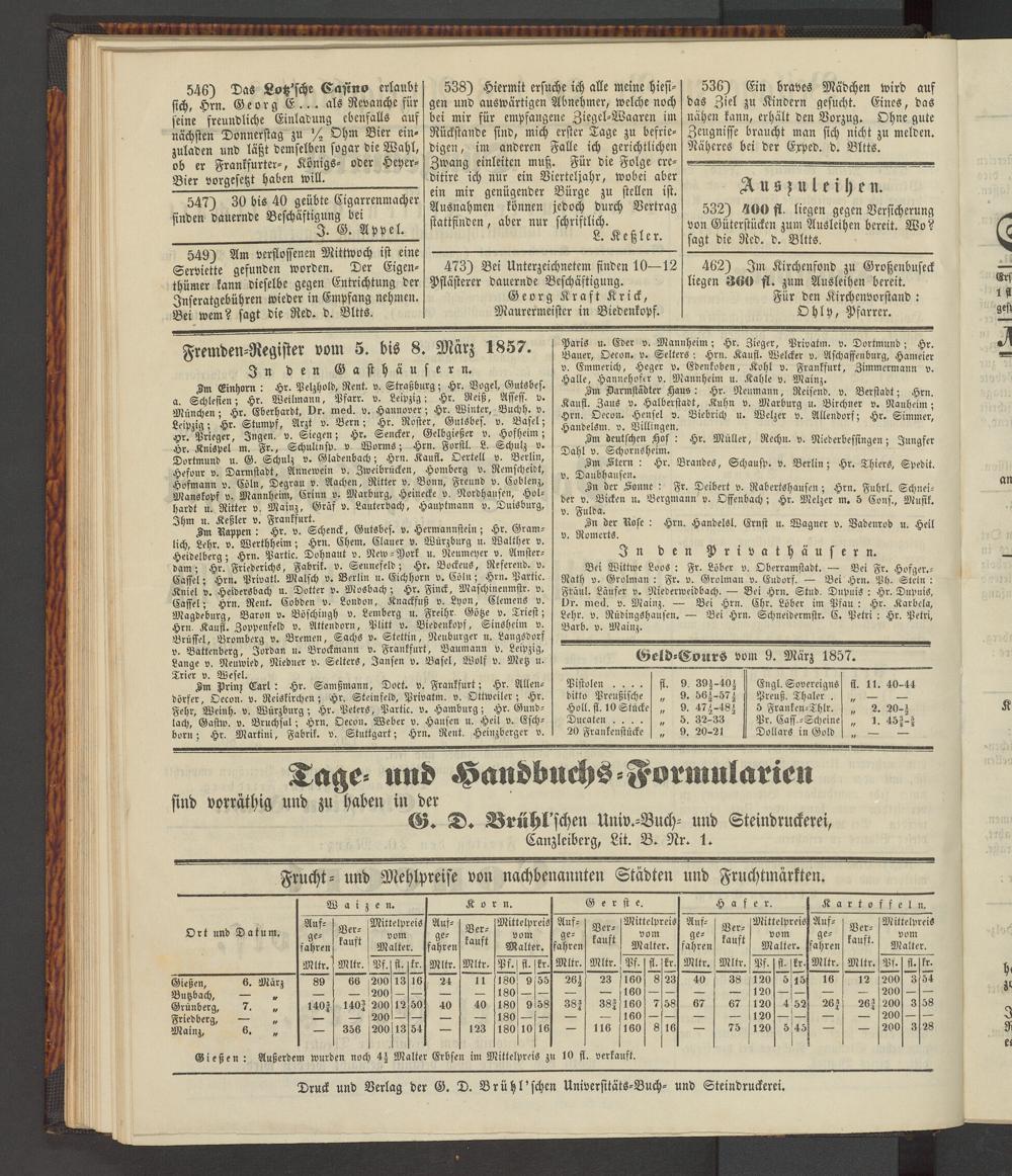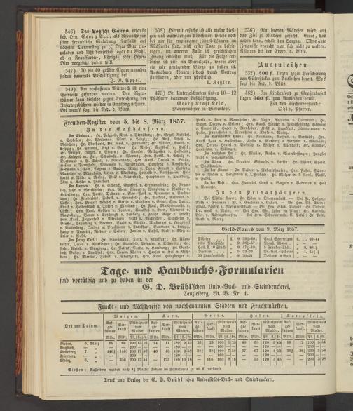 Im Darmstädter Haus: Hr. Reumann, Reisend, v. Berstadt; Hrn. Kaust. Zaus v. Halberstadt, Kuhn v. Marburg u. Birchner v. Nauheim; Hrn. Seeon. Hensel v. Biebrich u. Welzer v. Allendorf; Hr. Simmer, Handelsm. ». Villingen.