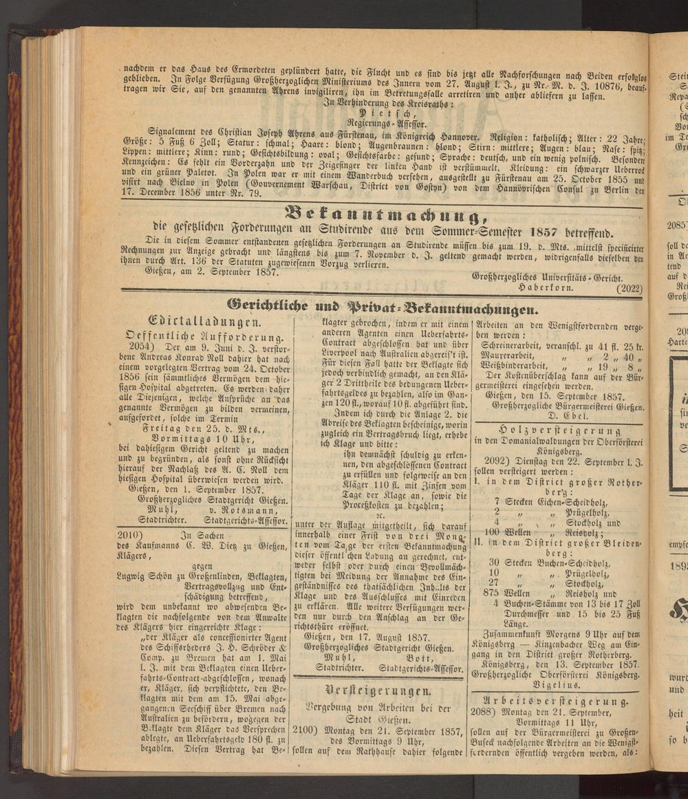 Gießen, den 1. September 1857. Großherzogliches Stadtgericht Gießen.