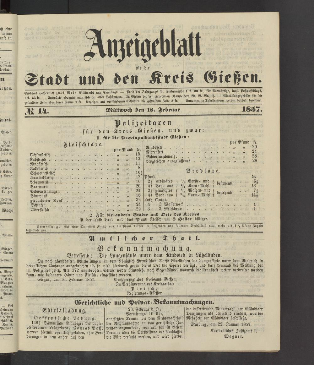 Gießen, am 16. Februar 1857. Großherzogliches Kreisamt Gießen.
