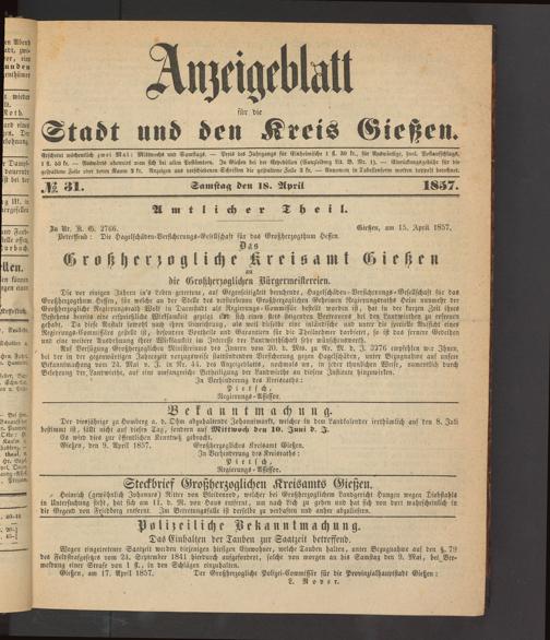 Gießen, am 17. April 1857. Der Großherzogliche Polizei-Commissär für die Provinzialhauptstadt Gießen: