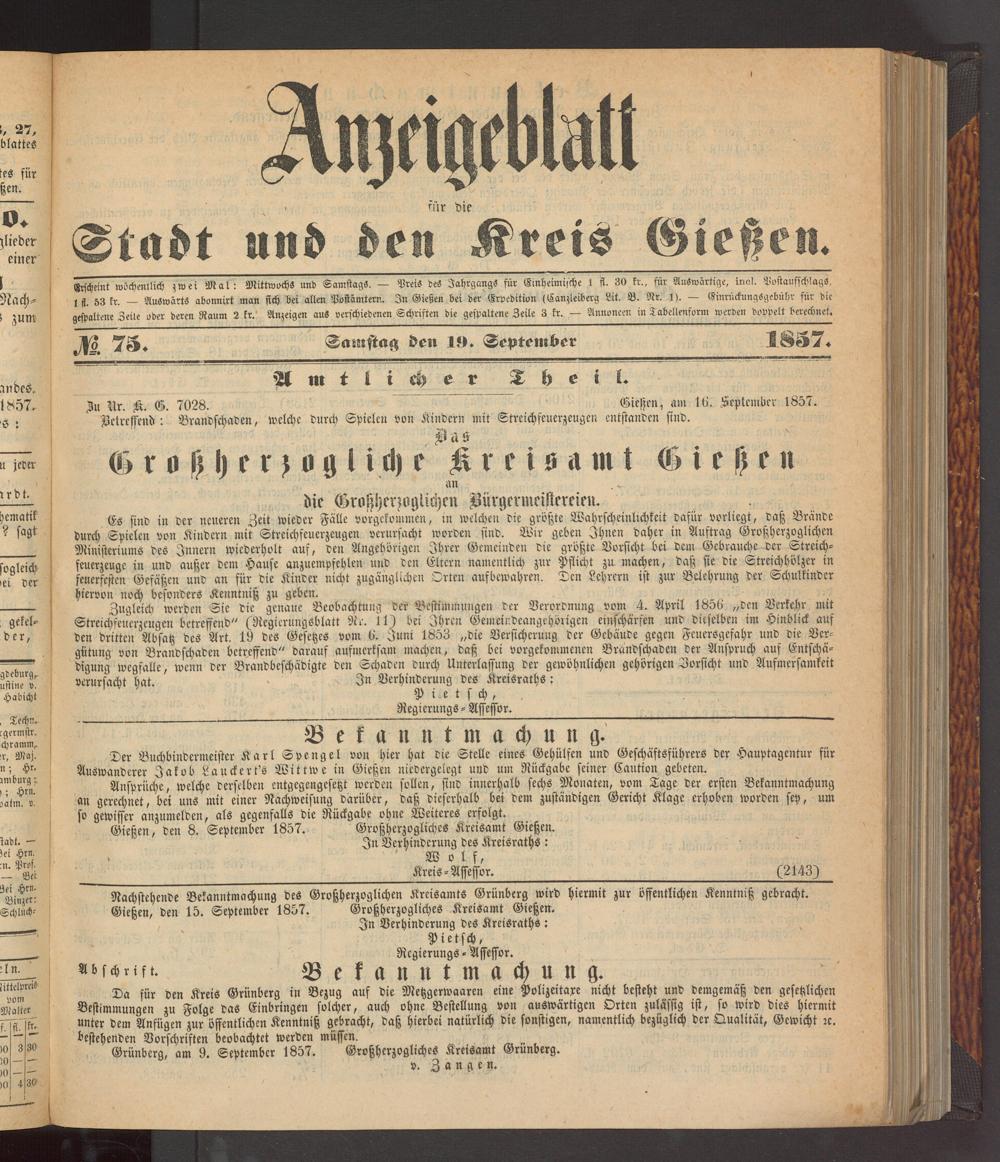 Nachstehende Bekanntmachung des Großherzoglichen Kreisamts Grünberg wird hiermit zur öffentlichen Kenntniß gebracht. Gießen, den 15. September 1857. Großherzogliches Kreisamt Gießen.