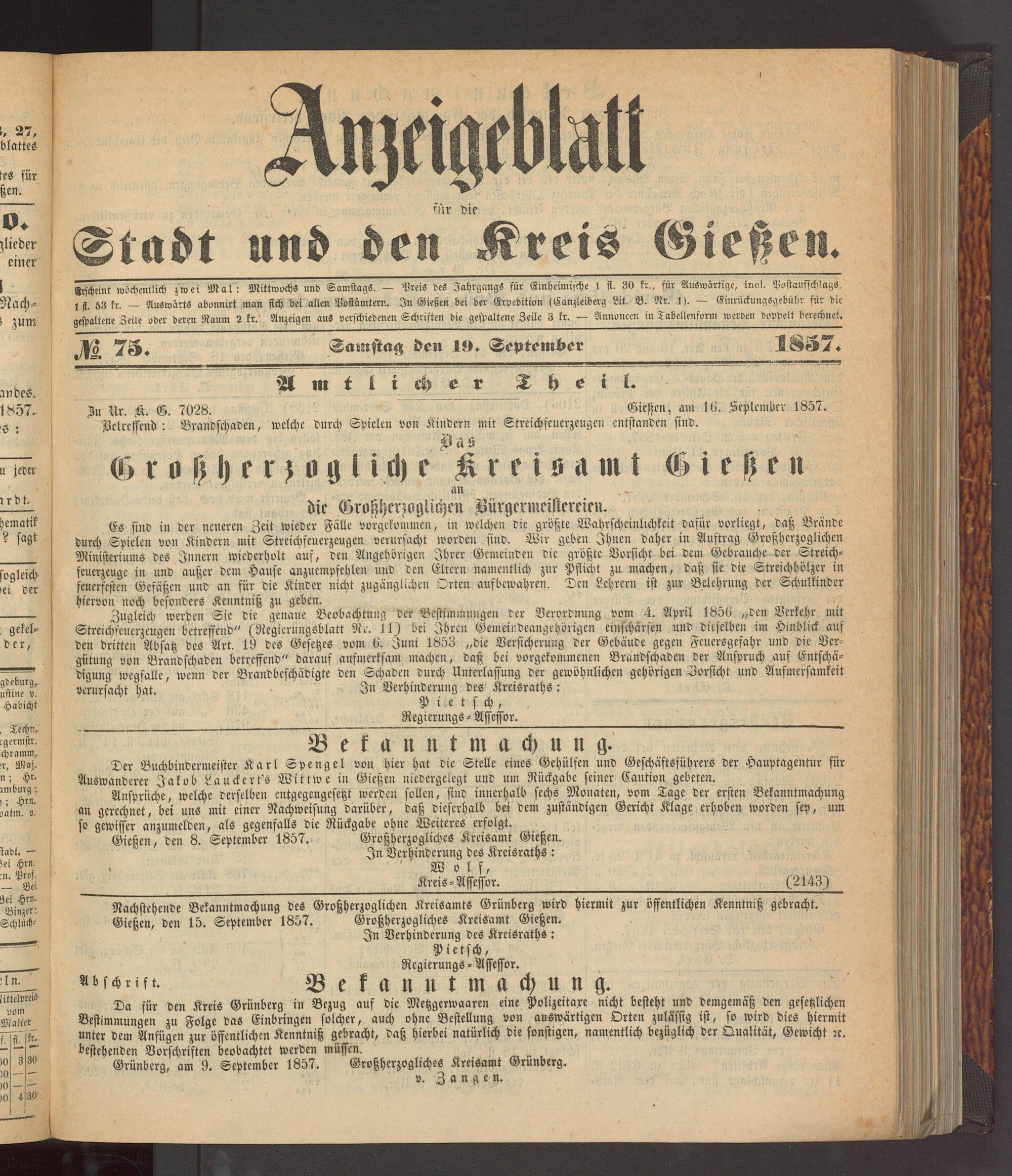 Gießen, den 8. September 1857. Großherzogliches Kreisamt Gießen.