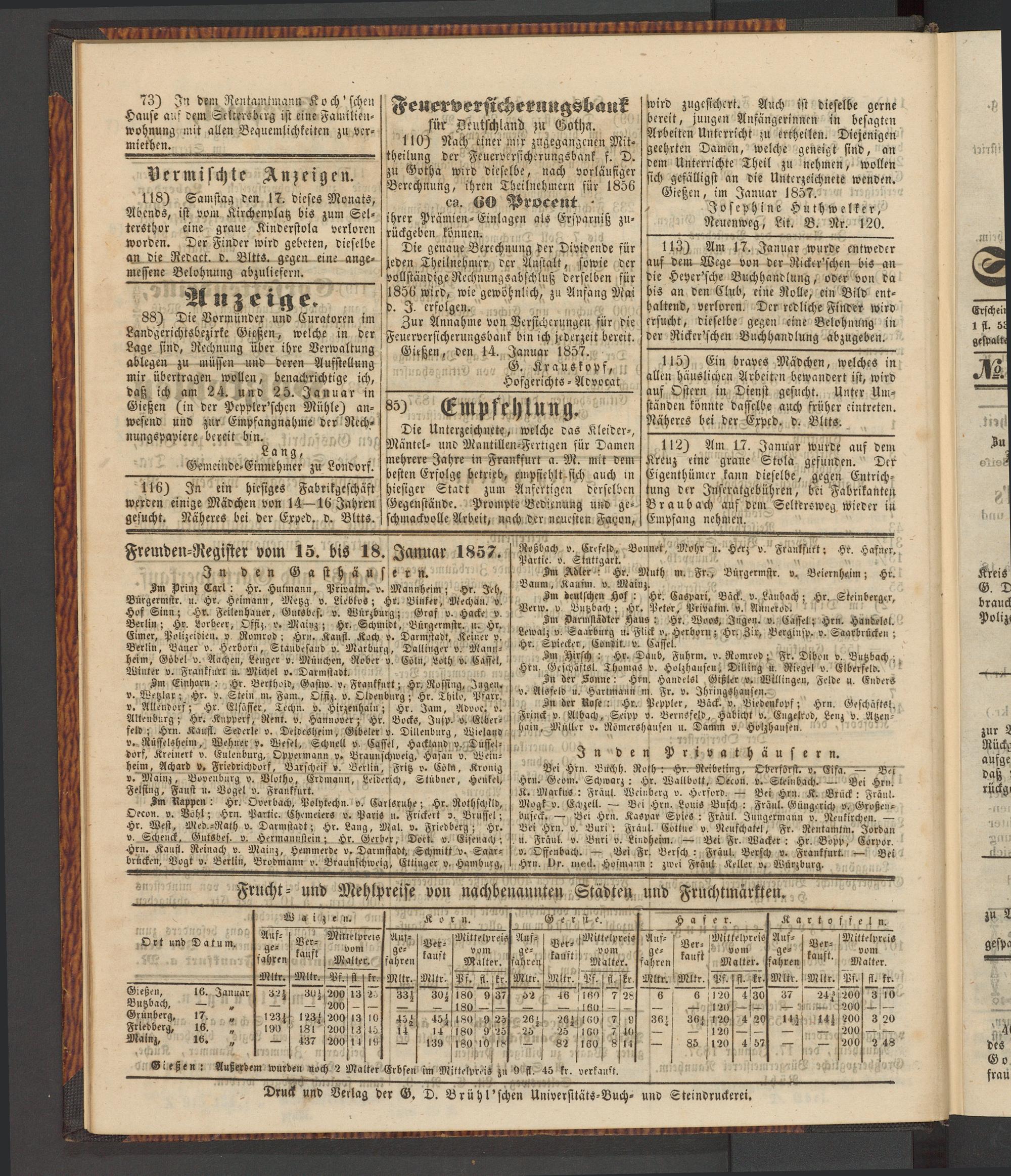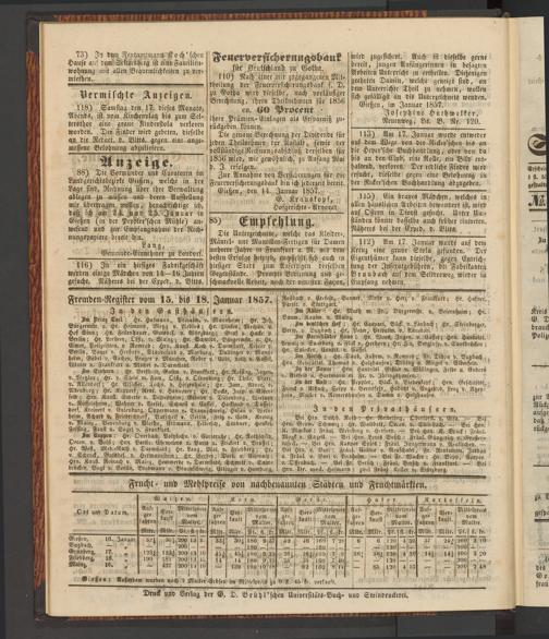 Fremden-Register vom 15. bis 18. Januar 1857.