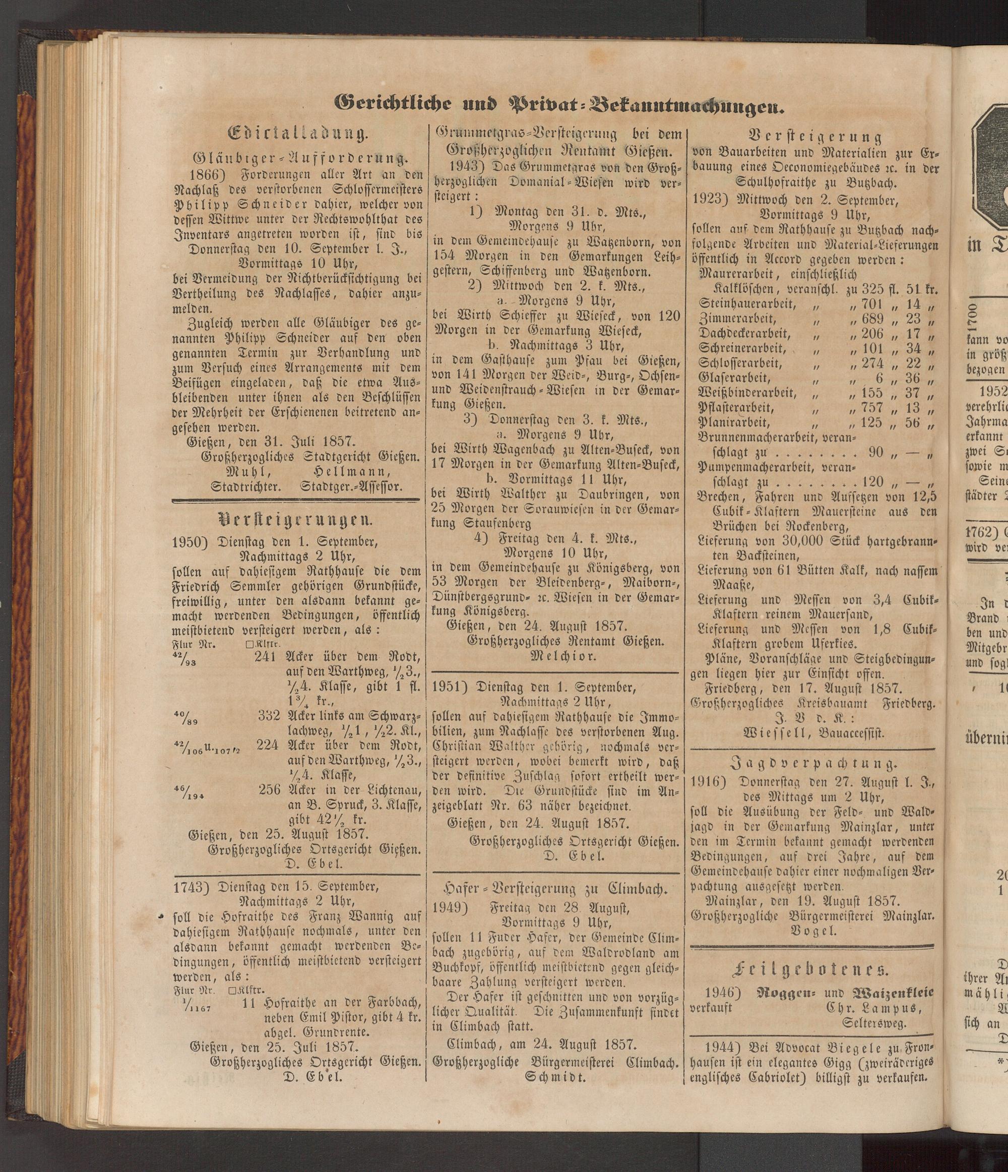 Gießen, den 25. August 1857. Großherzogliches Ortsgericht Gießen. D. Ebel.