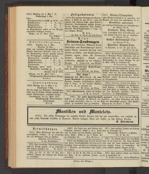1010) Im Gasthaus zum Hirsch ist das von Herrn Oberwachtmeister Kaltwasser bewohnte Logis anderweit zu vermiethen und in 3 Monaten, auf Verlangen auch früher, zu beziehen. ,_____________________________