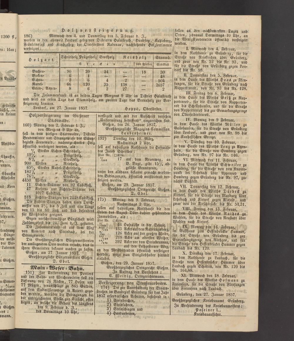 IV. Montag den 9 Februar, in dem Hause des Wirths Müller zu Geilshausen, für die Straße von Grünberg über Londorf, und zwar von Nr. 98 bis zur Kurhessifchen Grenze.