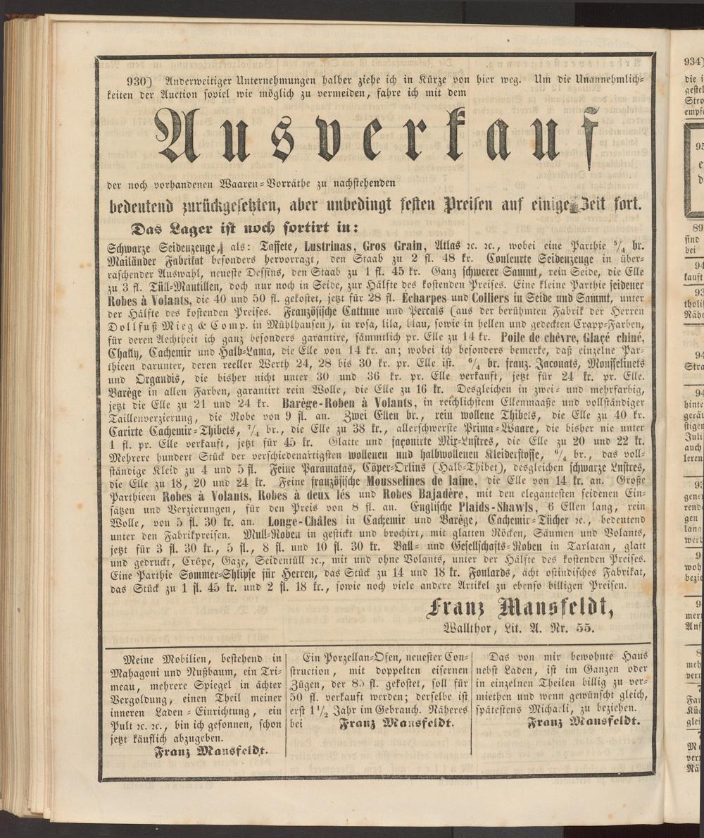 Schwarze Seideuzenge^ als: Taffete, Lustrinas, Gros Grain, Atlas re. re., wobei eine Parthie 74 br. Mailänder Fabrikat besonders hervorragt, den Staab zu 2 fl. 48 kr. Couleurte Seideuzeuge in überraschender Auswahl, neueste Dessins, den Staab zu 1 fl. 45 kr. Ganz schwerer Sammt, rein Seide, die Elle zu 3 fl. Tütl-Mantillen, doch nur noch in Seide, zur Hälfte des kostenden Preises. Eine kleine Parthie seidener Kobes ä Volants, die 40 und 50 fl. gekostet, jetzt für 28 fl. Kcharpes und Colliers in Seide und Sammt, unter der Hälfte des kostenden Preises. Französische Cattnne und Percats (aus der berühmten Fabrik der Herren Dollfuß Mi eg & C o m p. in Mühlhausen), in rosa, lila, blau, sowie in hellen und gedeckten Crapp-Farben, für deren Aechtheit ich ganz besonders garantire, sämmtlich pr. Elle zu 14 kr. Foile de chevre, Glase Chine, Chaüy, Cachemir und Halb-Lama, die Elle von 14 kr. an; wobei ich besondere bemerke, daß einzelne Par- thieen darunter, deren reeller Werth 24, 28 bis 30 kr. pr. Elle ist. % br. franz. Jaconats, Mouffelinets und Organdis, die bisher nicht unrer 30 und 36 kr. pr. Elle verkauft, jetzt für 24 kr. pr. Ette. Barege in allen Farben, garanlirt rein Wolle, Vie Elle zu 16 kr. Desgleichen in zwei- und mehrfarbig, jetzt die Elle zu 21 und 24 kr. Barege■ Roben ä Volants, in reichlichstem Ellenmaaße und vollständiger Taillenverzierung, die Robe von 9 ft? an. Zwei Ellen br., rein wollene Thibcls, die Elle zu 40 kr. Carirte Cachemir-Thibets, 74 br., die Elle zu 38 kr., allerschwerste Prima-Waare, die bisher nie unter 1 fl. pr. Elle verkauft, jetzt für 45 kr. Glatte und fatzomrte Mix-Lnstres, Vie Elle zu 20 und 22 kr. Mehrere hundert Stück der verschiedenartigsten wollenen uni) halbwollenen Kleiderstoffe, 74 br., das vollständige Kleid zu 4 und 5 fl. Feine Paramatas, Cöper-Orlins (Halb-Thibet), desgleichen schwarze Lnstres, die Elle zu 18, 20 und 24 kr. Feine französische Mousselines de laine, die Elle von 14 kr. an. Große Parthieen Rohes ä Volants, Rohes ä deux les und Rohes Bajadere, mit den elegantesten seidenen Einsätzen und Verzierungen, für den Preis von 8 fl. au. Englische Plaids ■ Siiawls, 6 Ellen lang, rein Wolle, von 5 fl. 30 kr. an. Longe-Chäles in Cachemir und Barege, Cachemir - Tücher re., bedeutend unter den Fabrikpreisen. Mull-Robe.i in gestickt und brochirt, mit glatten Nöcken, Säumen und Volants, jetzt für 3 fl. 30 kr., 5 fl., 8 fl. und 10 fl. 30 kr. Ball- und Gesellschafts-Roben in Tarlatan, glatt und gedruckt, Crepe, Gaze, Seidentüll rc., mit und ohne Volants, unter der Hälfte des kostenden Preises. Eine Parthie Sommer-Shlipse für Herren, das Stück zu 14 und 18 kr. Foulards, ächt ostindisches Fabrikat, das Stück zu 1 fl. 45 kr. und 2 fl. 18 kr., sowie noch viele andere Artikel zu ebenso billigen Preisen.